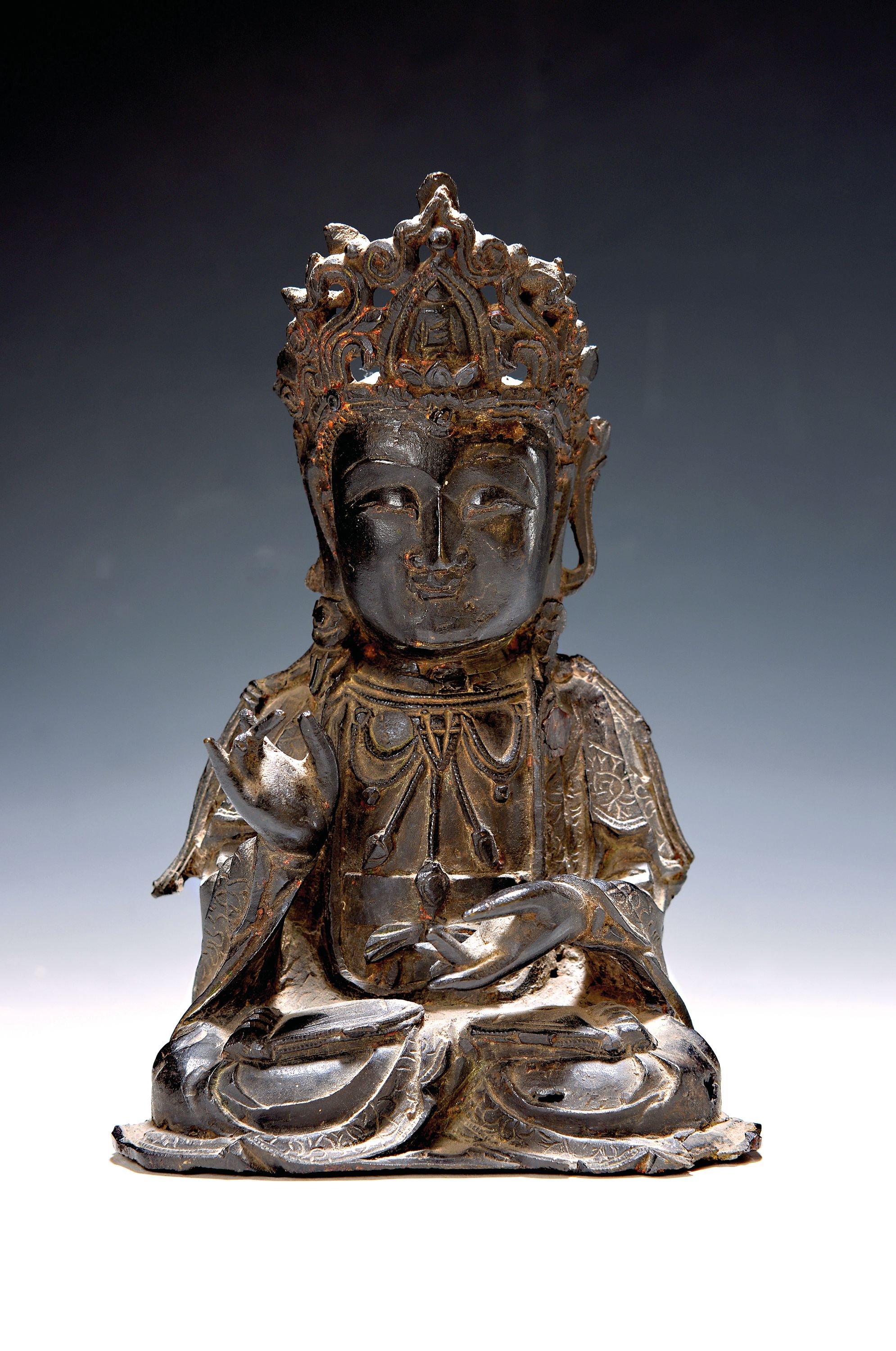 Sitzender Buddha, Ming-Dynastie, China, 17. Jh., Eisen, feiner Guß, z.T. altersbedingt