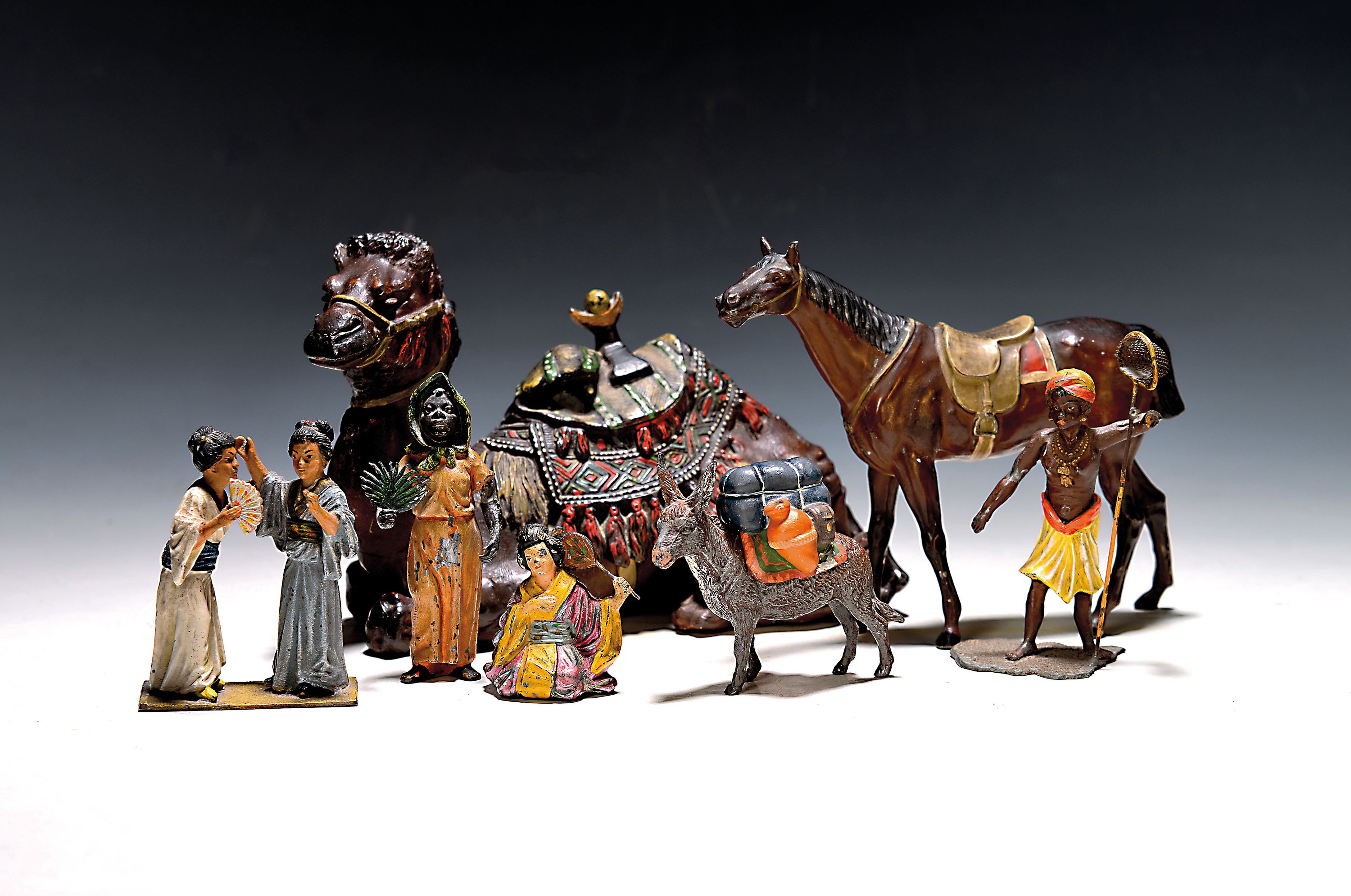7 Figuren, Wien, um 1900, Metall bemalt, Pferd mit Sattel, H. 14.3 x 16.5 cm, liegendes