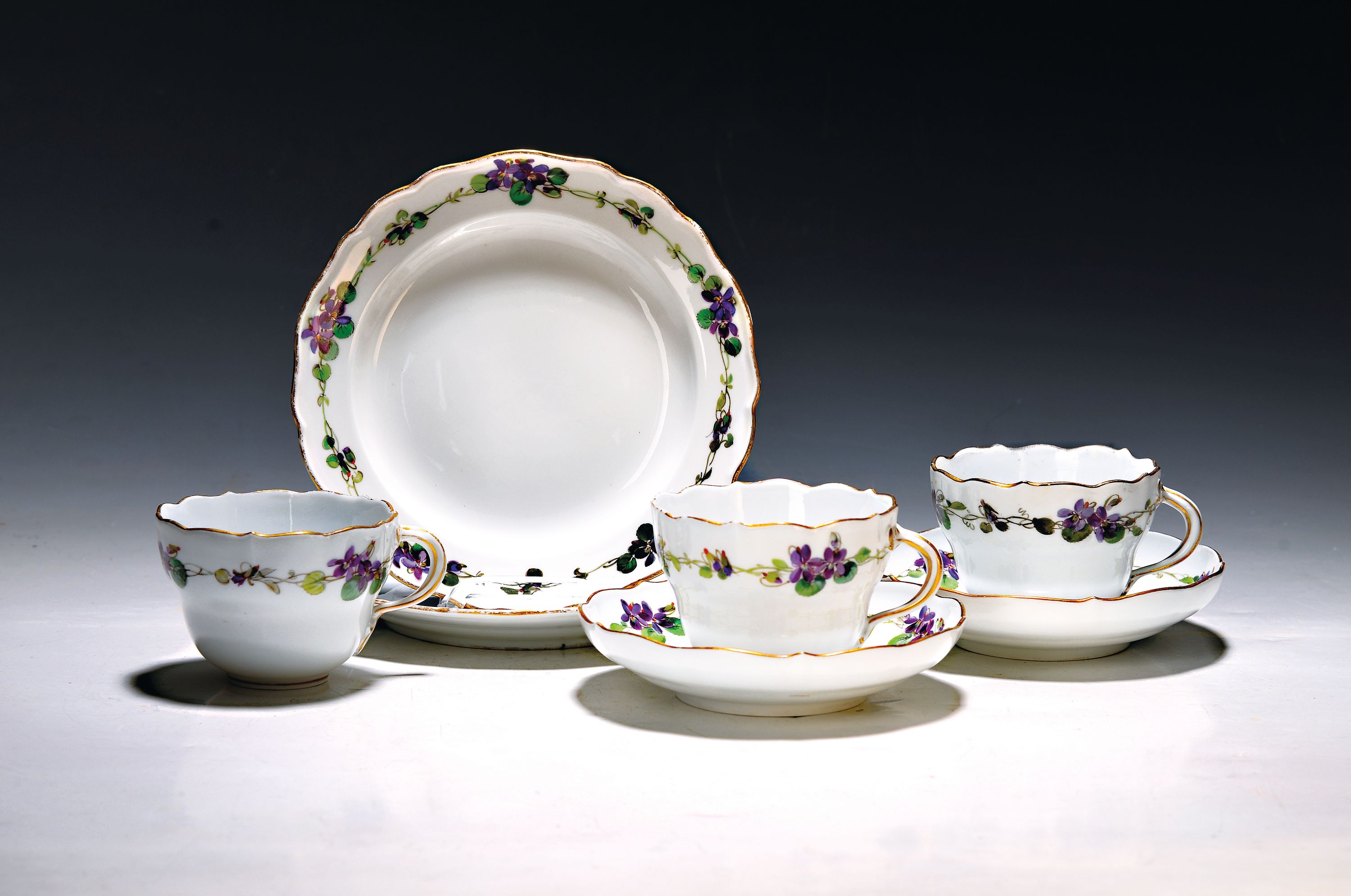 7 Teile Porzellan, Meissen, um 1900, 1. Wahl, mit Veilchen-Bordüren bemalt, Goldrand,