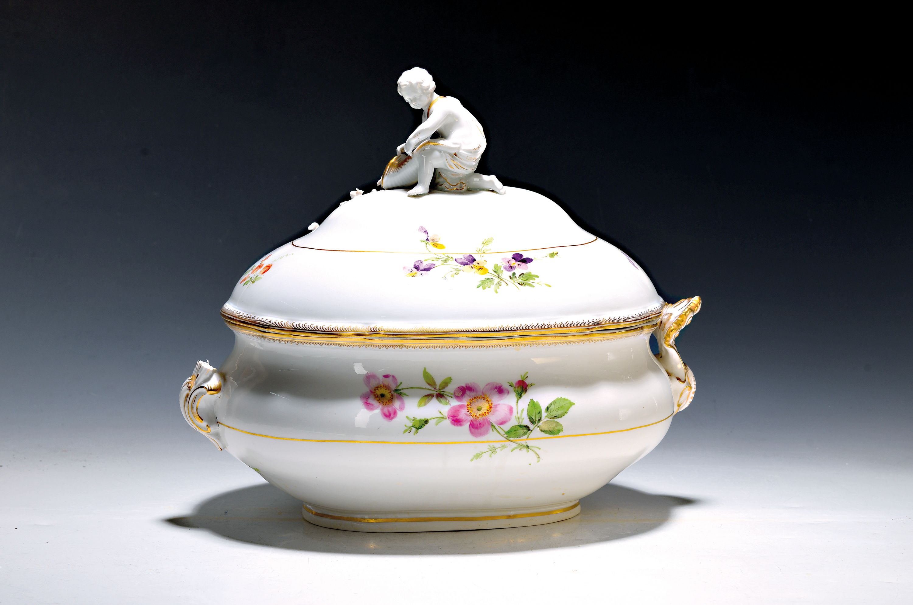 Deckelterrine, Meissen, um 1870-80, 2. Wahl, bunt bemalt im Dekor Blume I, Goldkante,