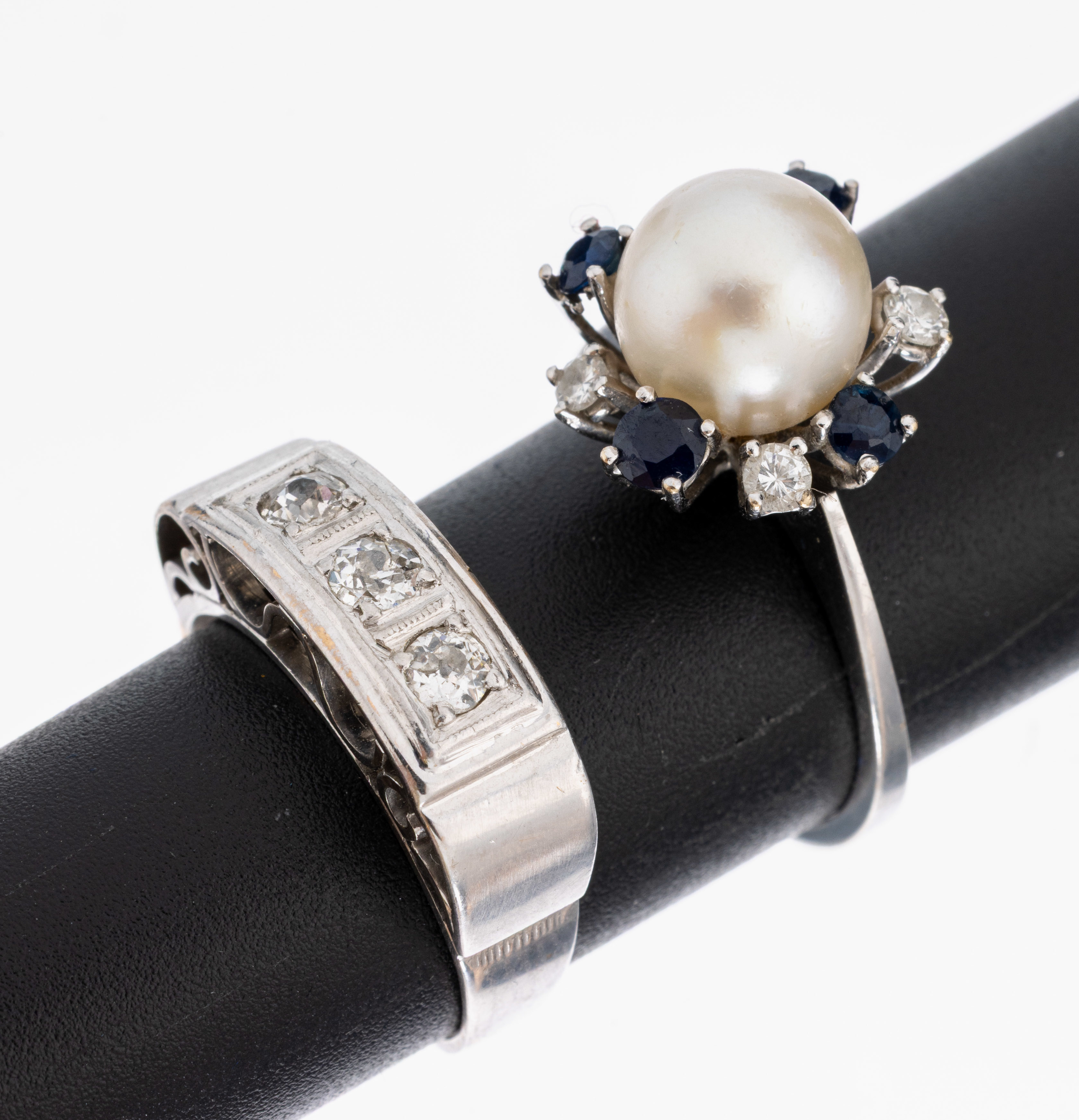Konvolut 2 Ringe, best. aus: 1 x WG 750/000, mittig Zuchtperle, D. ca. 8.8 mm, 4