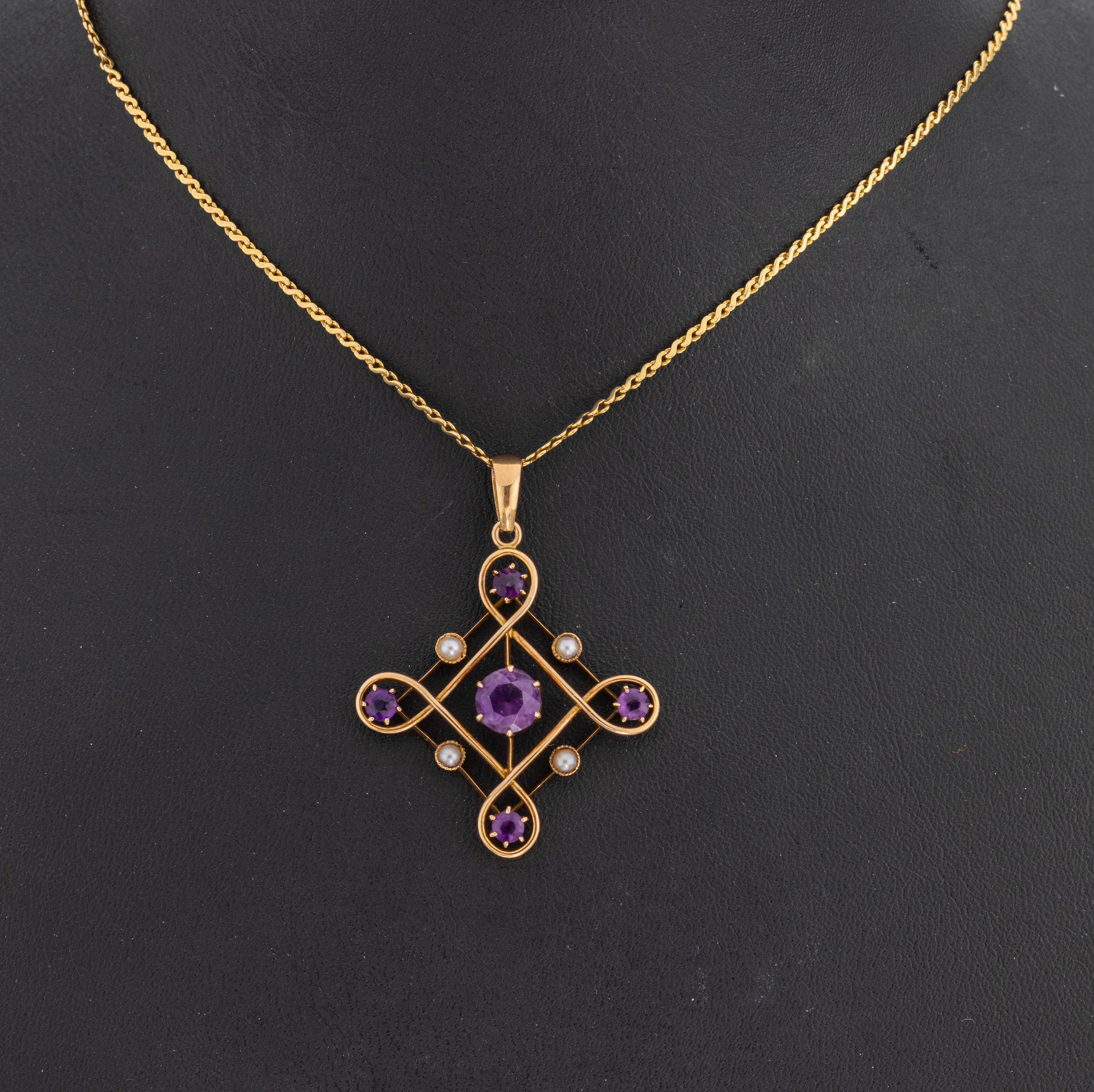 15 kt Gold Amethyst-Perl-Anhänger, England um 1900, GG 625/000, reiner Jugendstil,