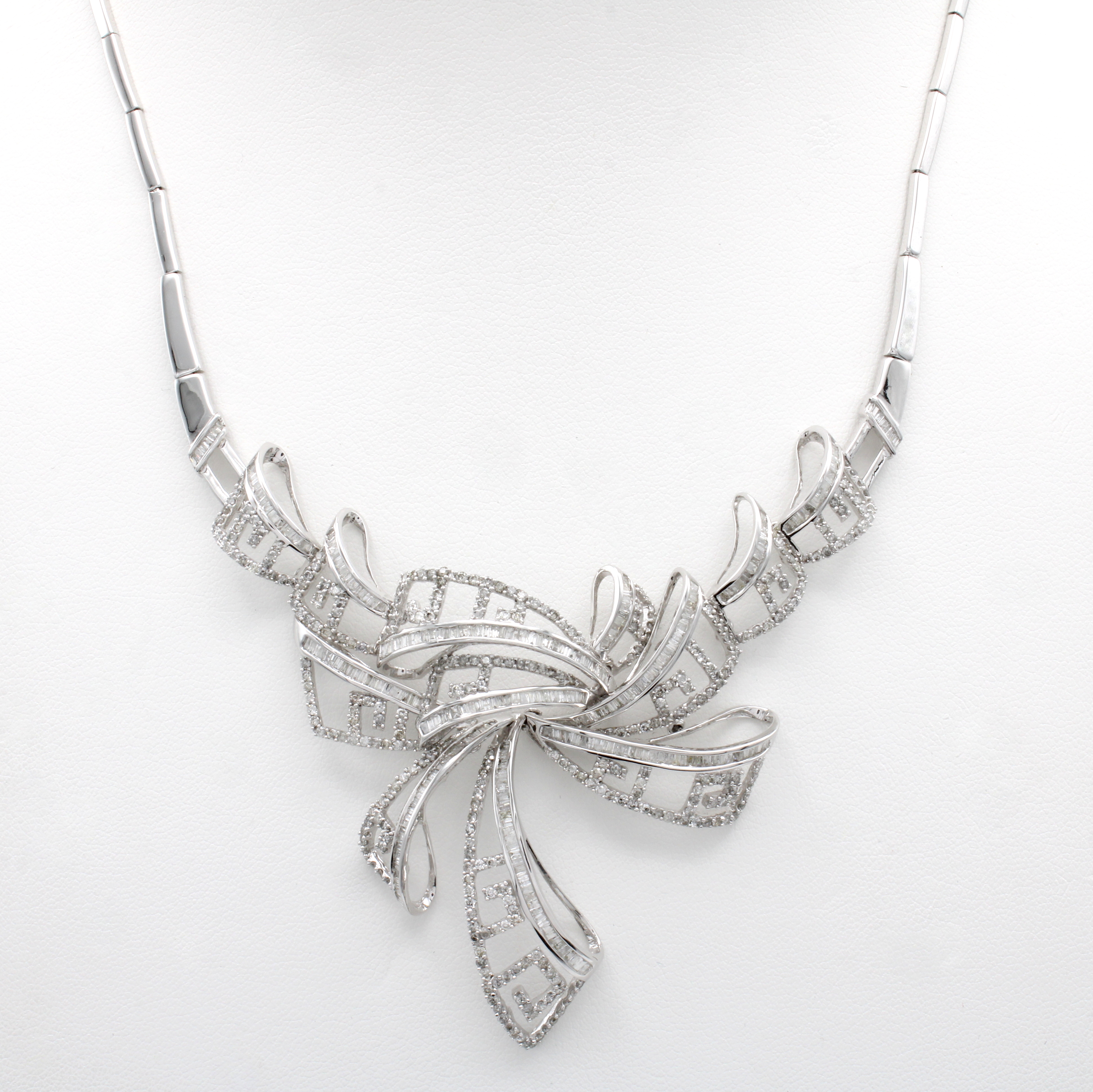 Collier mit Diamanten und Brillanten, WG 750/000, Diam. zus. ca. 2.05 ct u. Brill. zus. ca. 2.72 ct feines Weiß-Weiß/p, Steckschl. m. zwei Sicherheitsbügeln, L. ca. 42 cm Schätzpreis: 11800, - EUR
