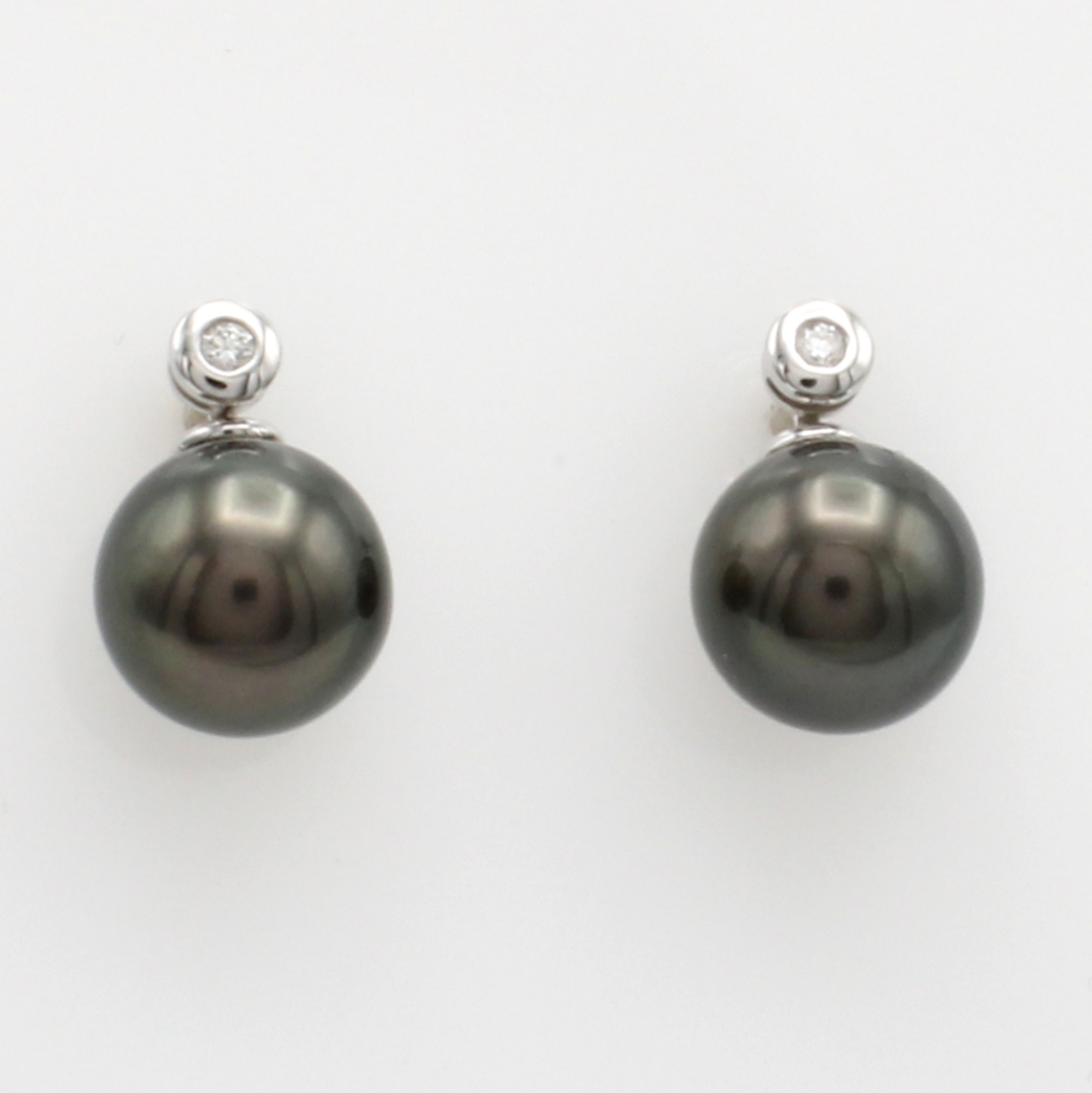 Paar Ohrstecker mit Tahitizuchtperlen und Brillanten, WG 585/000, 2 Brill. zus. ca. 0.05 ct Weiß/si, dunkle Perlen, D. ca. 9-10 mm(auch ohne Perlabhängungen tragbar) Schätzpreis: 1200, - EUR