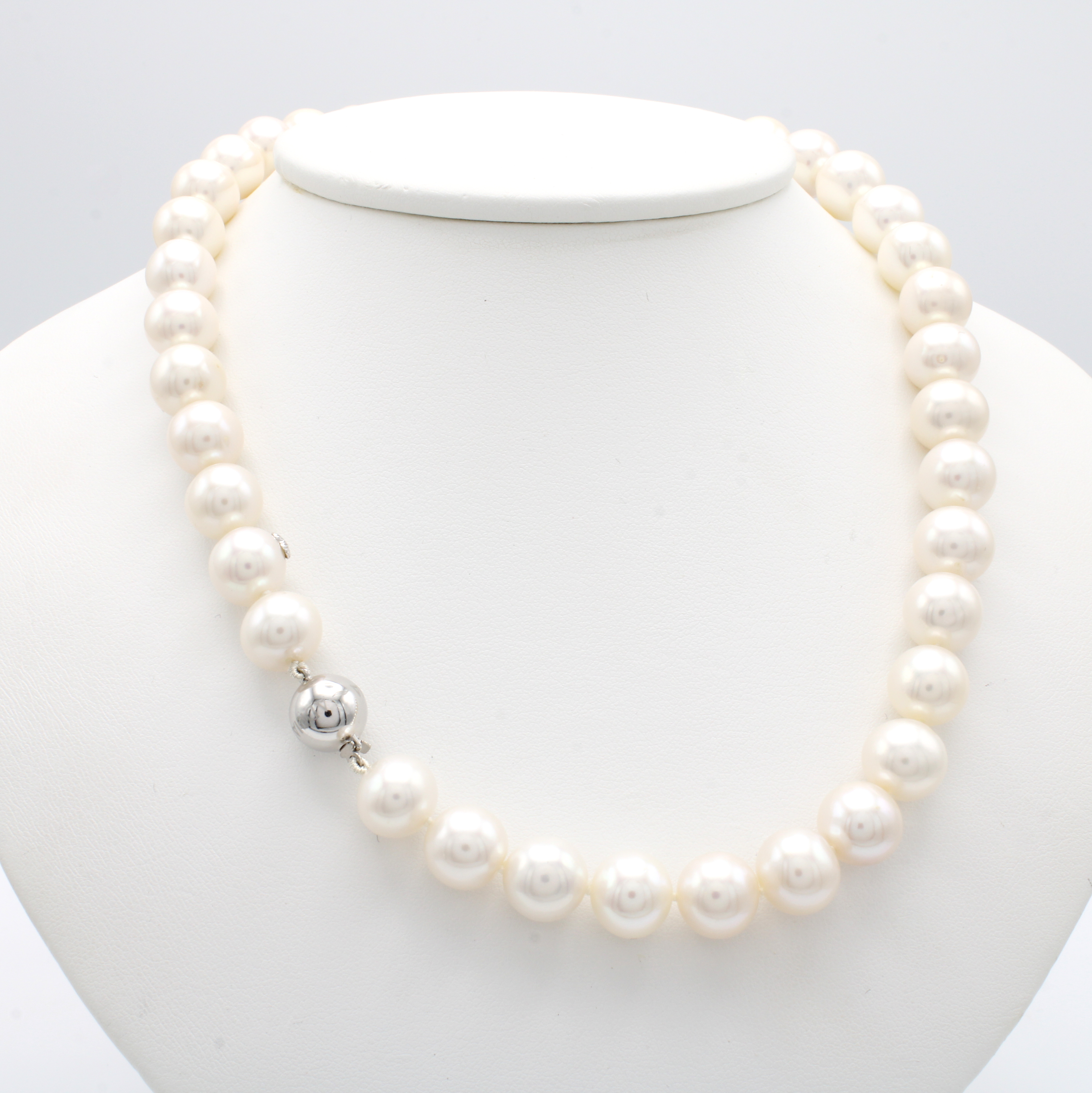 Süßwasserzuchtperlenkette, Kugelschl. WG 585/000, weiße Perlen, D. ca. 11-12 mm, L. ca.44 cm Schätzpreis: 1500, - EUR