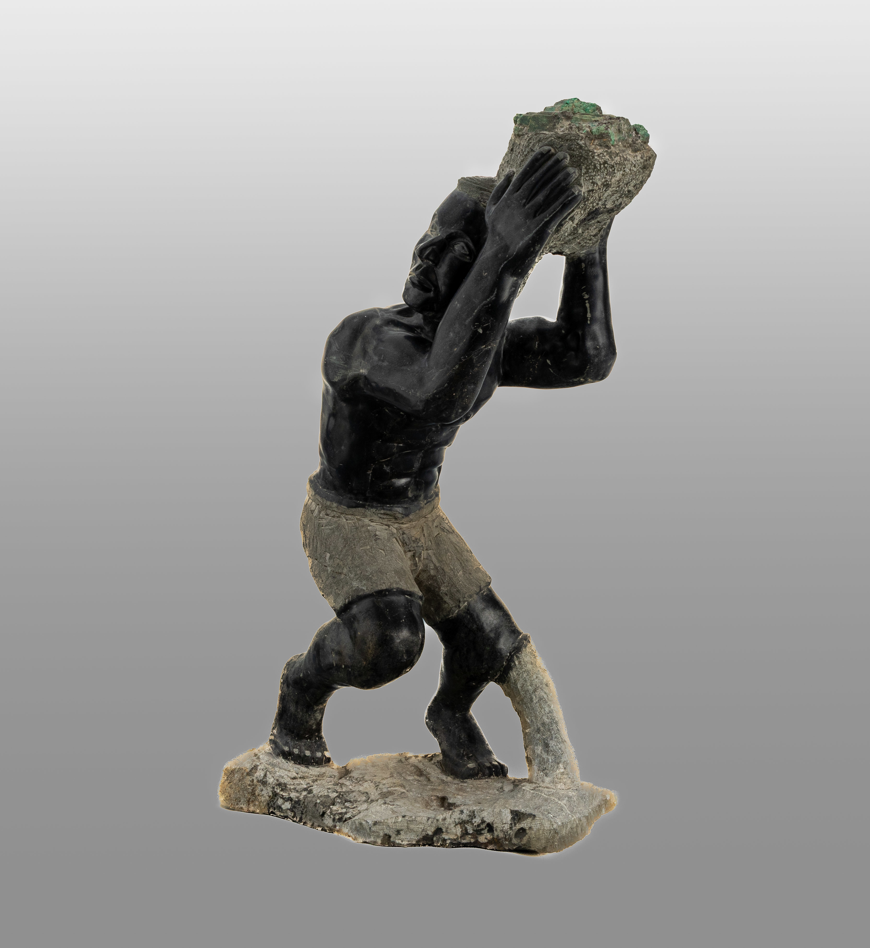 Steinskulptur mit Smaragd, Darstellung eines Bergarbeiters, aus einem Stück Stein