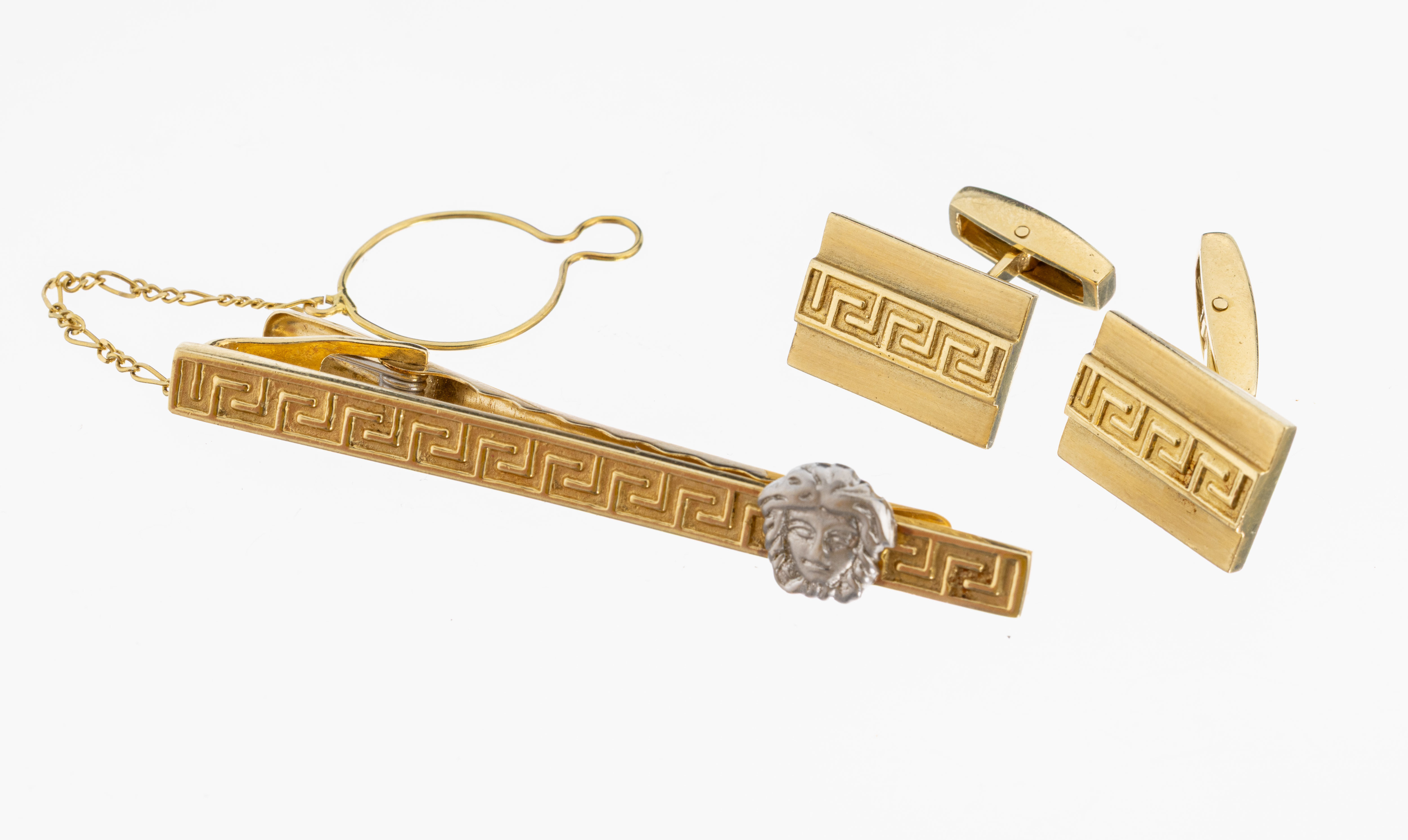 14 kt Gold Herrenschmuckset, GG 585/000, best. aus: 1 Paar Manschettenknöpfe, und