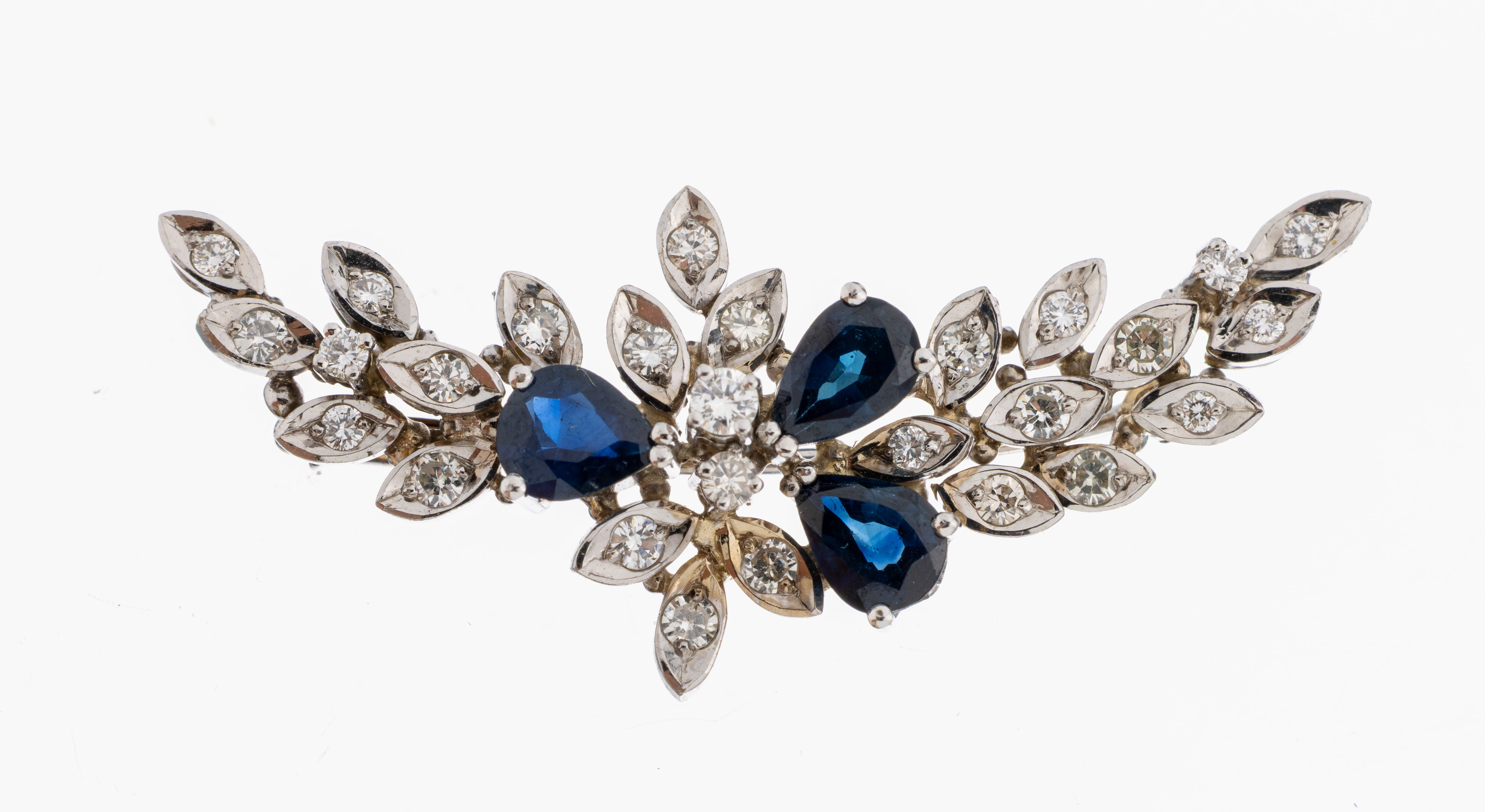 14 kt Gold Saphir-Brillant-Brosche, 1970er Jahre, WG 585/000, floral, 3 facett. Saphir-Tropfen