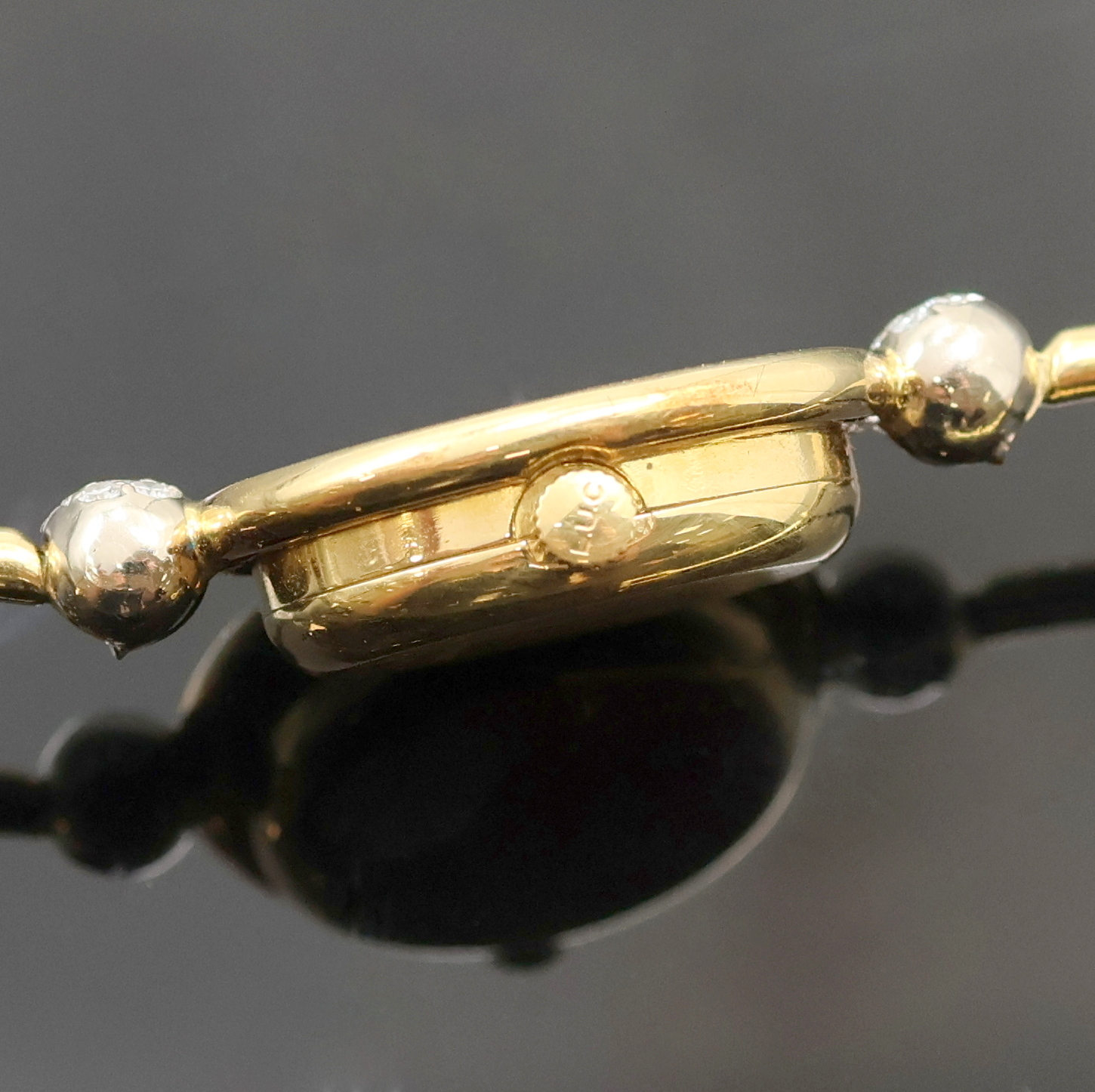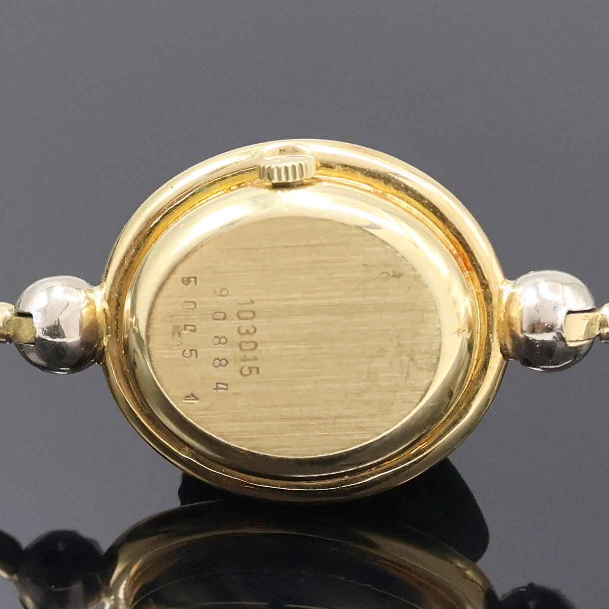 Schweiz um 1985, Handaufzug, Boden aufgedr., Bandanstöße m. Diamanten bes., gold.