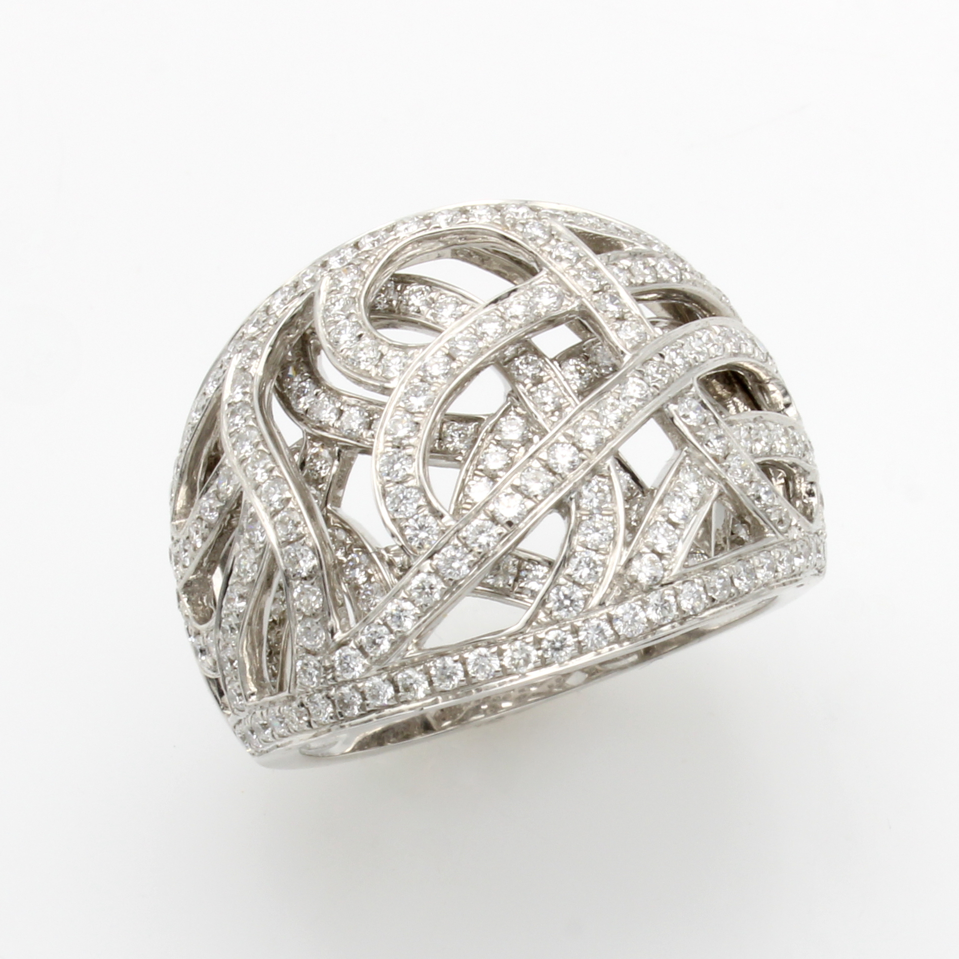 Ring mit Brillanten, WG 750/000, ornament- reich u. verschlungen gearb., 212 Brill. zus. ca. 1.38 ct feines Weiß/si, RW ca. 56 Schätzpreis: 8200, - EUR
