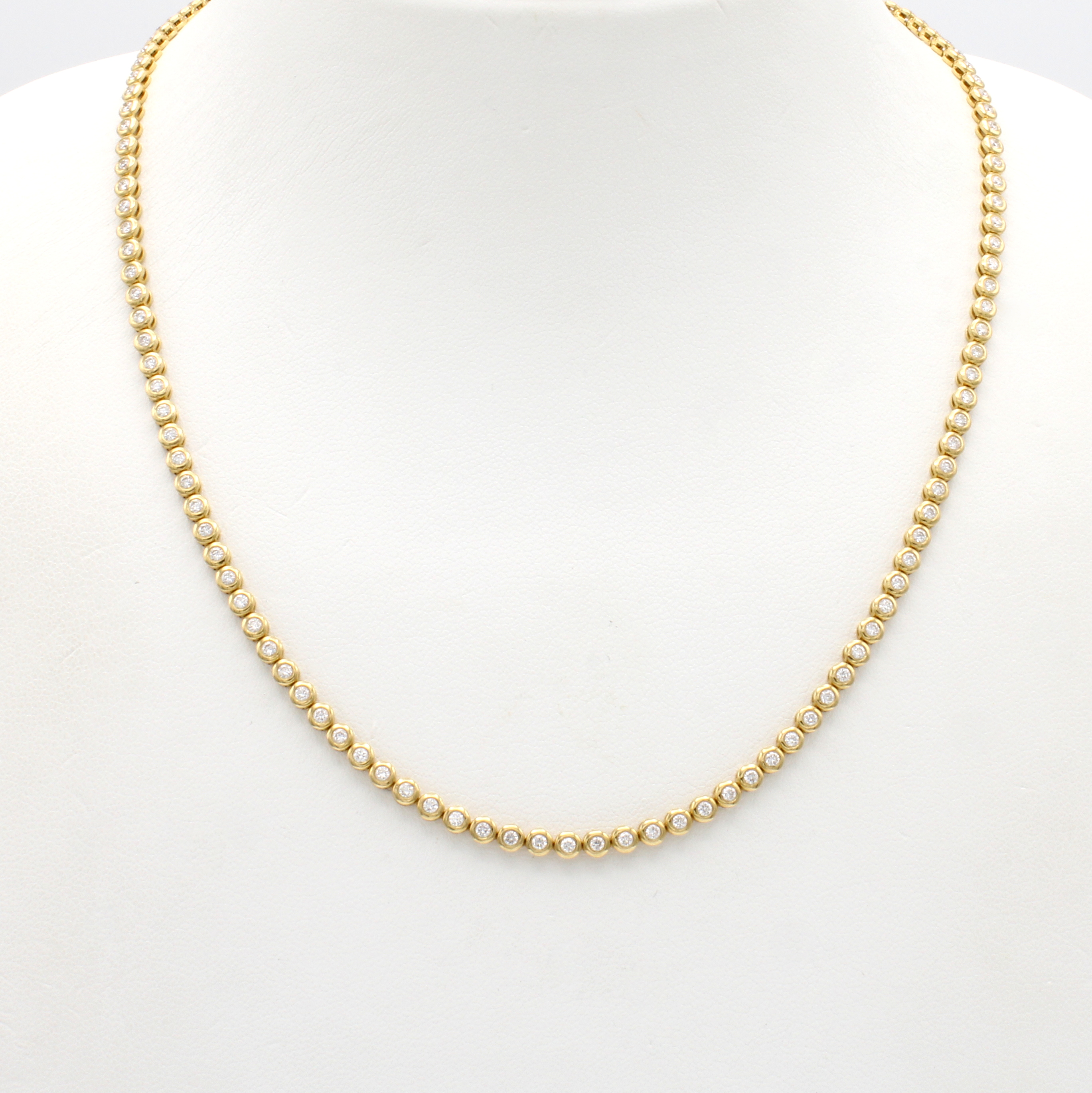 Collier mit Brillanten, GG 750/000, vollbes.m. insges. 128 Brill. in Zargenfassungen zus. ca. 2.30 ct feines Weiß/si, Kastenschl. m. 2 Sicherheitsbügeln, L. ca. 42 cm Schätzpreis: 12000, - EUR