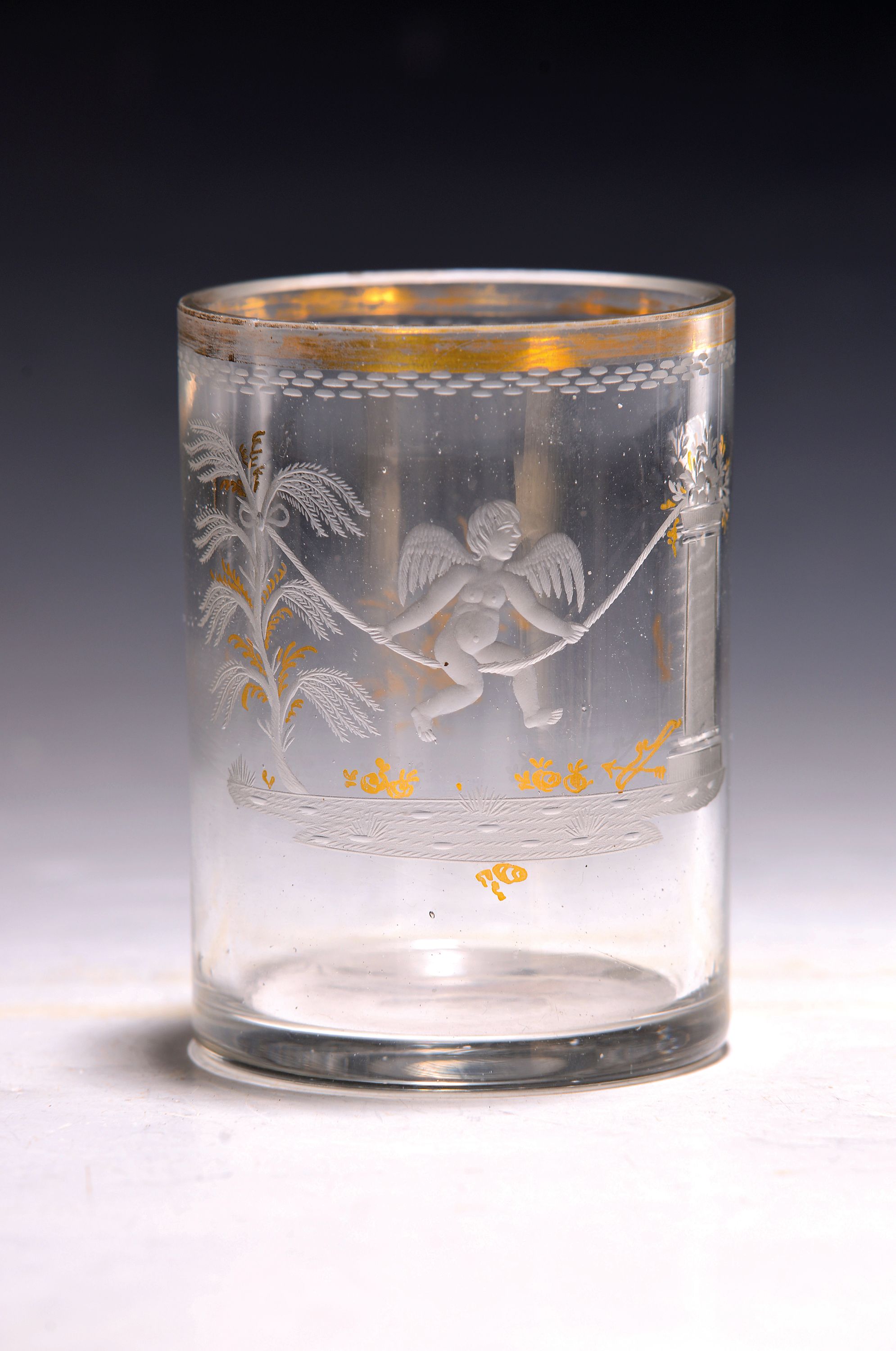 Klassizistischer Becher, um 1800, farbloses Glas, geschliffener Dekor, Amorette auf