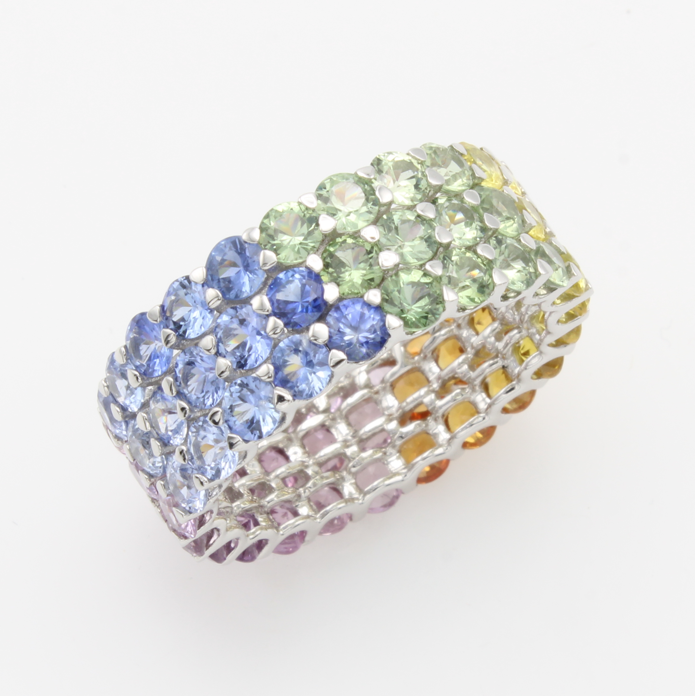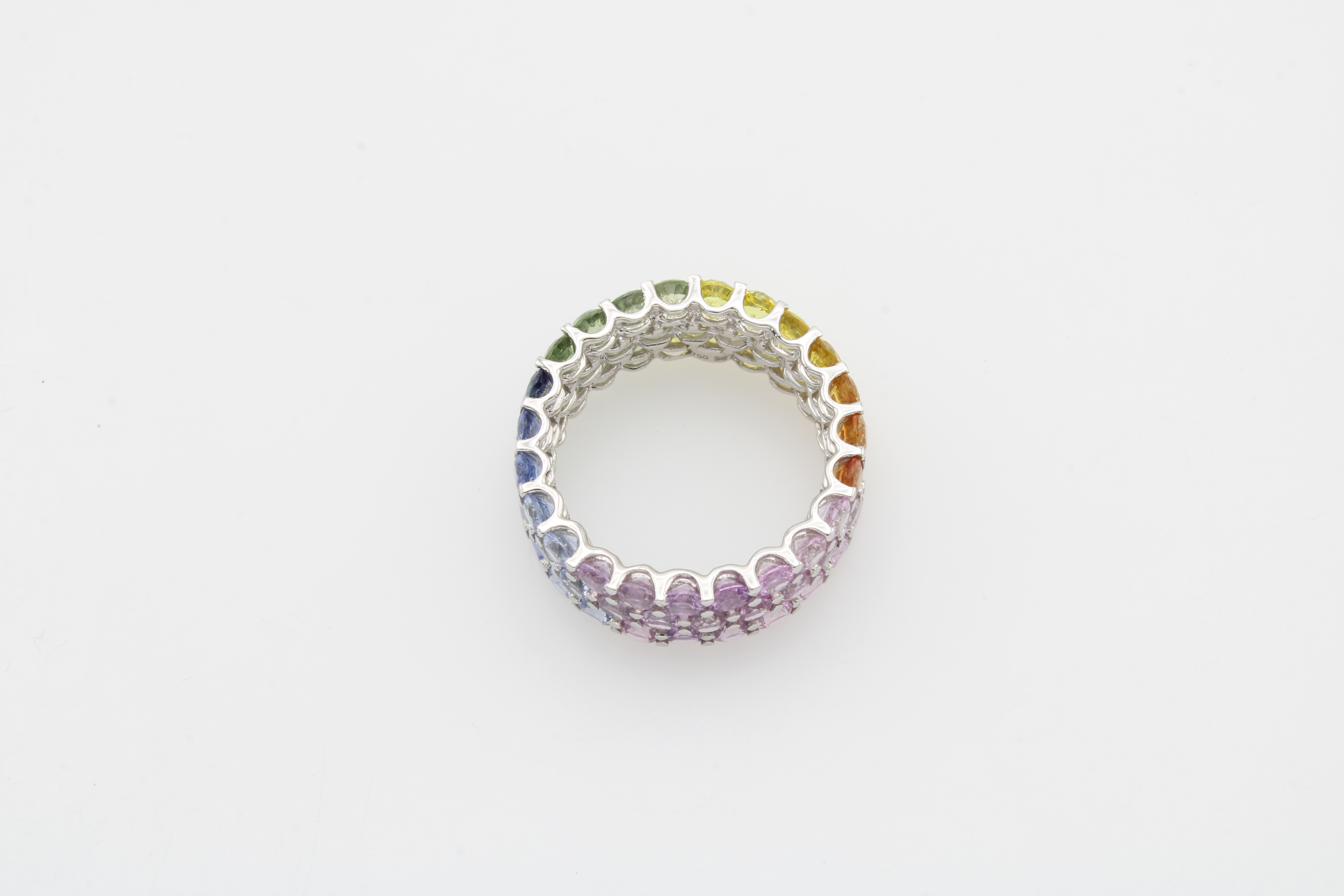 Memoryring mit Saphiren, WG 750/000, 3-rhg.,69 fancy Saphire im Farbverlauf zus. ca. 9.04 ct, RW ca. 56 Schätzpreis: 7200, - EUR