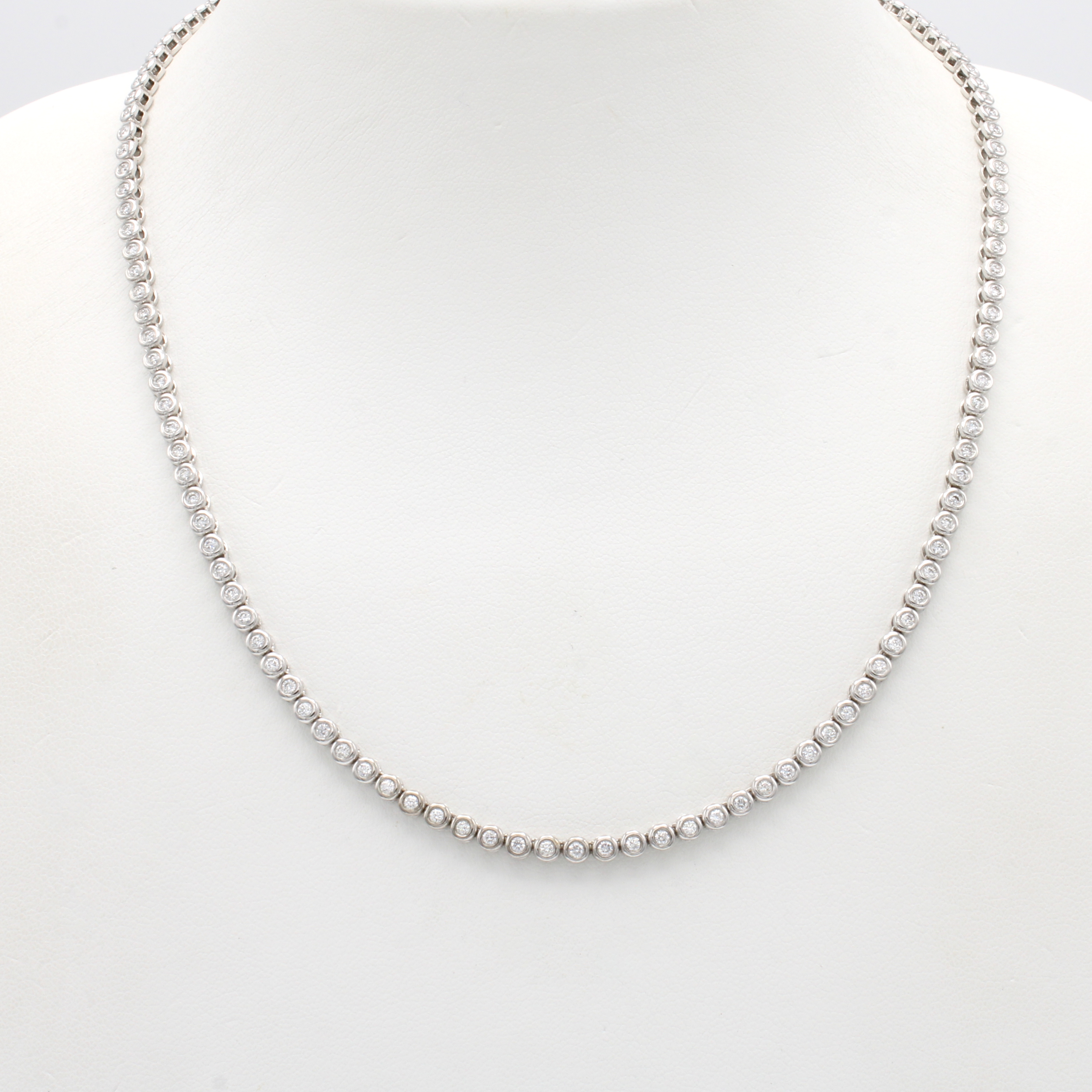 Collier mit Brillanten, WG 750/000, voll bes. m. insges. 128 Brill. in Zargenfassungen zus. ca. 2.30 ct feines Weiß/si, Kastenschl. m. 2 Sicherheitsbügeln, L. ca. 42 cm Schätzpreis: 12000, - EUR