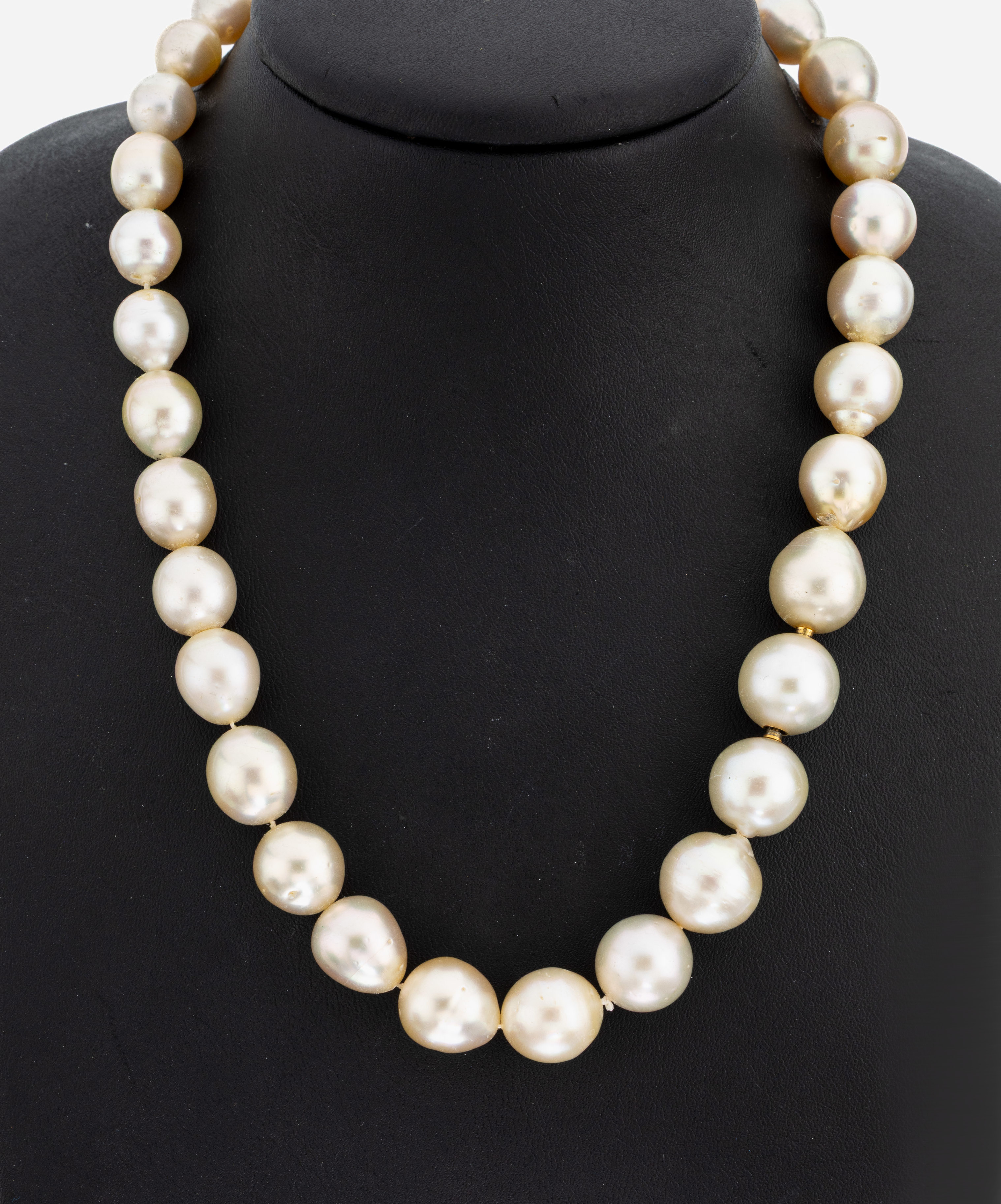 Zuchtperl-Collier mit 18 kt Gold Schließe, GG 750/000, 34 unrunde Südseezuchtperlen