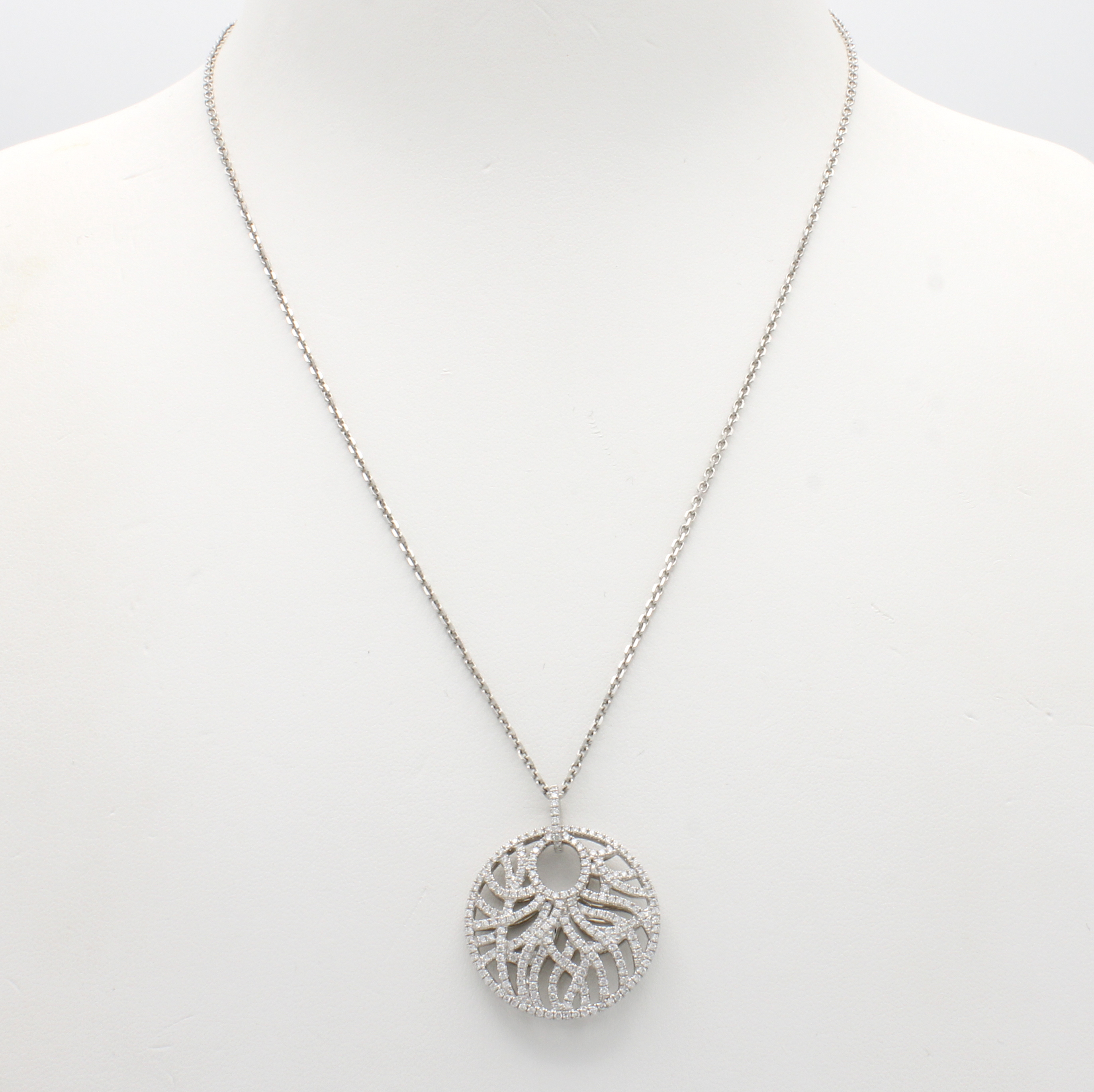 Anhänger mit Brillanten an Kette, WG 750/000, kreisförm., 242 Brill. zus. ca. 1.41 ct feines Weiß/si, Karabinerschl., L. ca. 49, 51.5 u. 54 cm Schätzpreis: 8400, - EUR