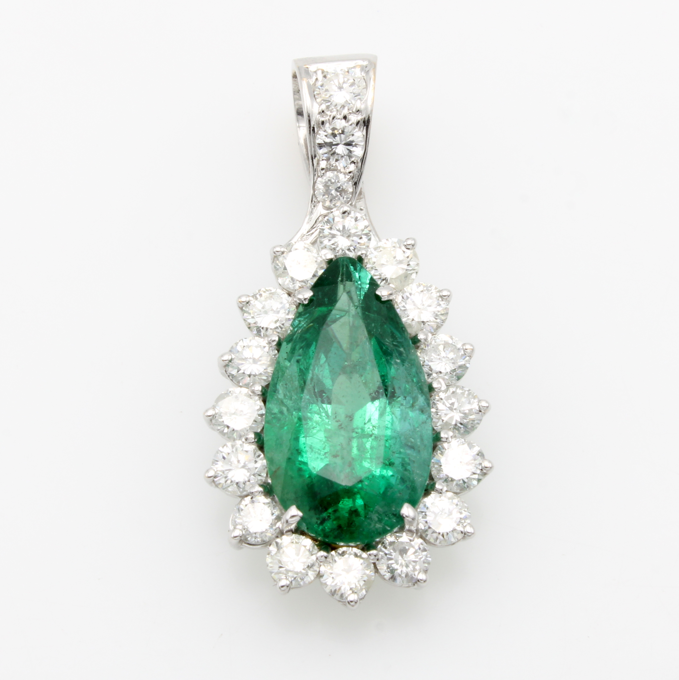 Anhänger mit Smaragd und Brillanten, WG WG 585/000, tropfenförm. Anh., Smaragd- tropfen ca. 7.20 ct umgeben v. 19 Brill. zus. ca. 2.40 ct feines Weiß/si Schätzpreis: 26400, - EUR