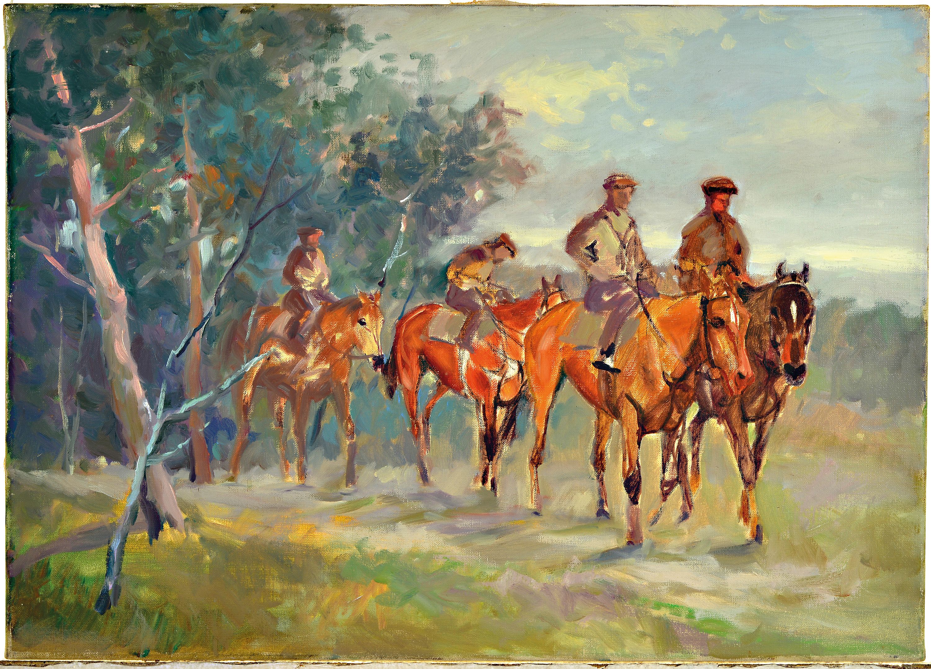 Hans Deiters, 1868 Düsseldorf-1922 München, Reitergruppe vor Waldkulisse, verso