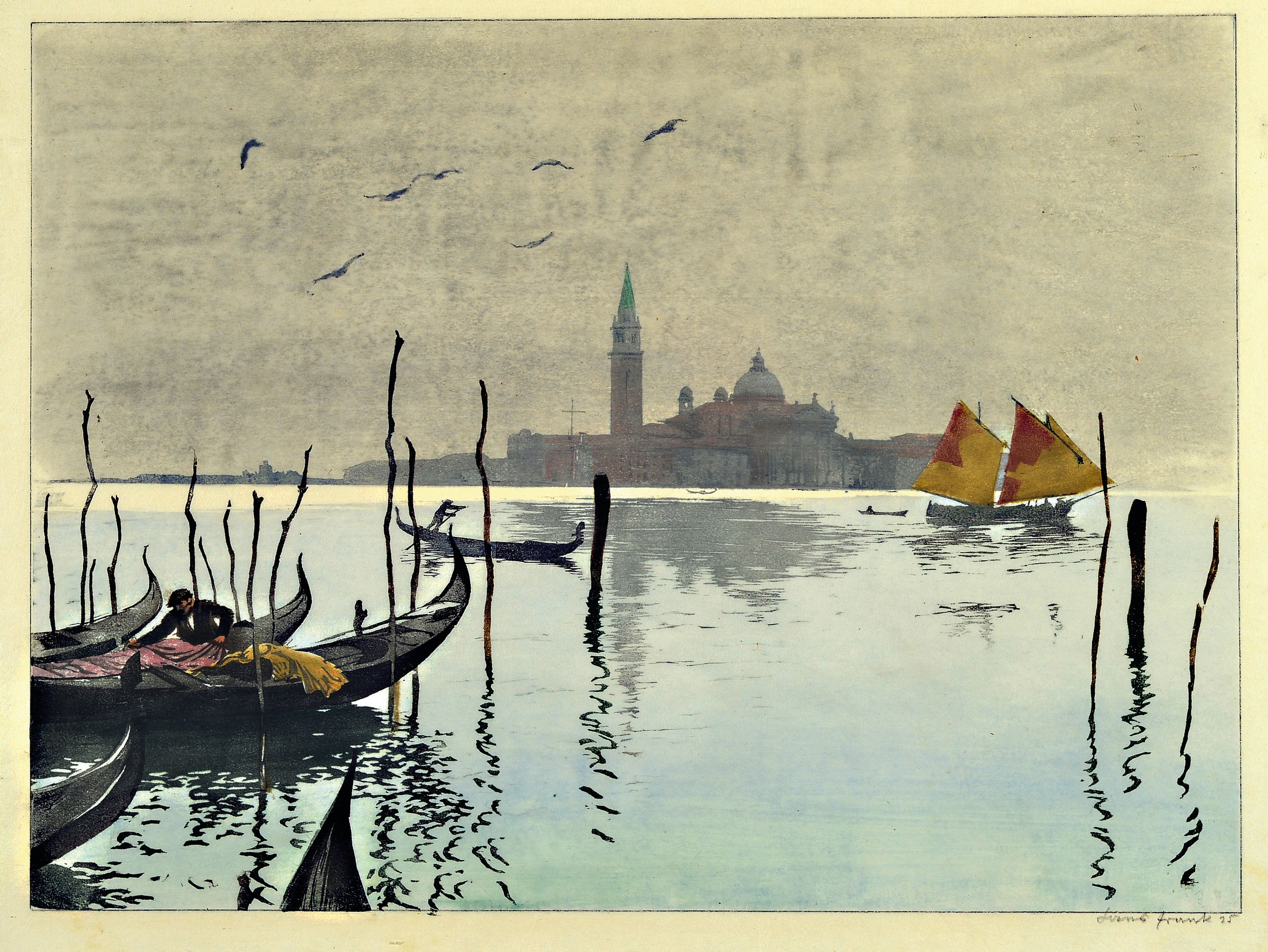 Hans Frank, 1884 Wien-1948 Salzburg, Farbholzschnitt, Venedig, San Giorgio von der Piazzetta aus, 1925, Platte 29x39 cm, unter Glas gerahmt 38x45 cm