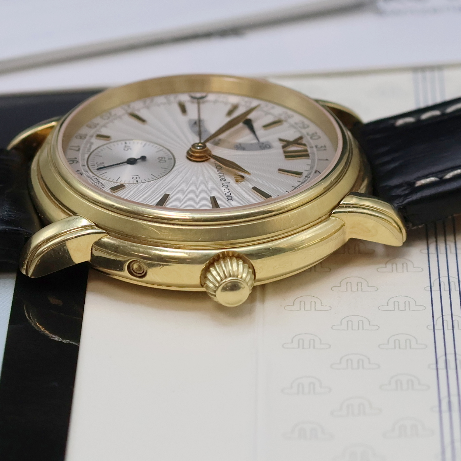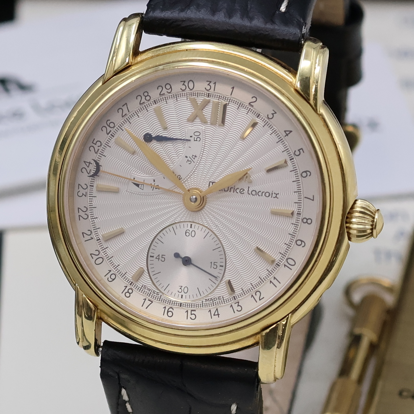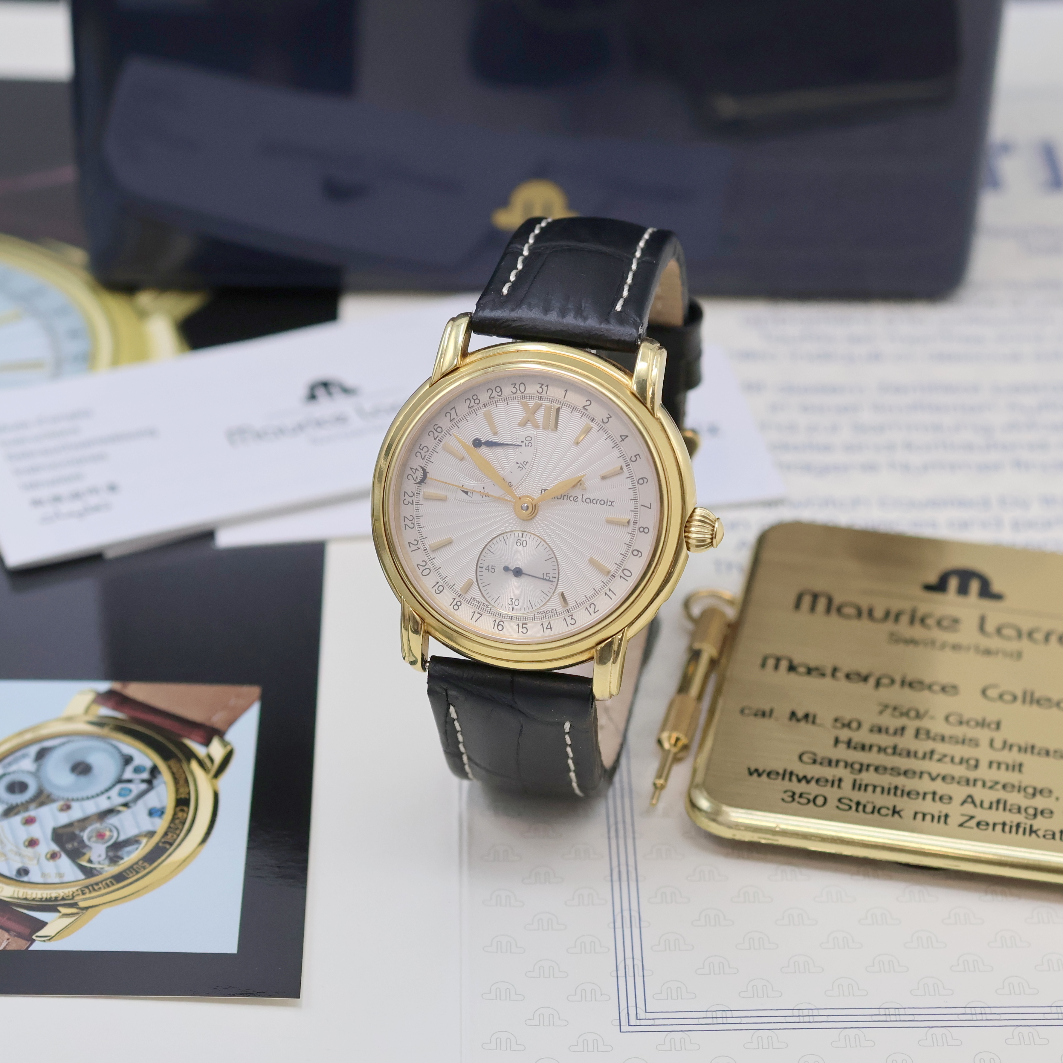 gold. Std.-Ind. u. Zeigern, Gangreserve, kl. Sek. b. 6, Zeigerdatum, Kal. ML 50 (Basiskal.