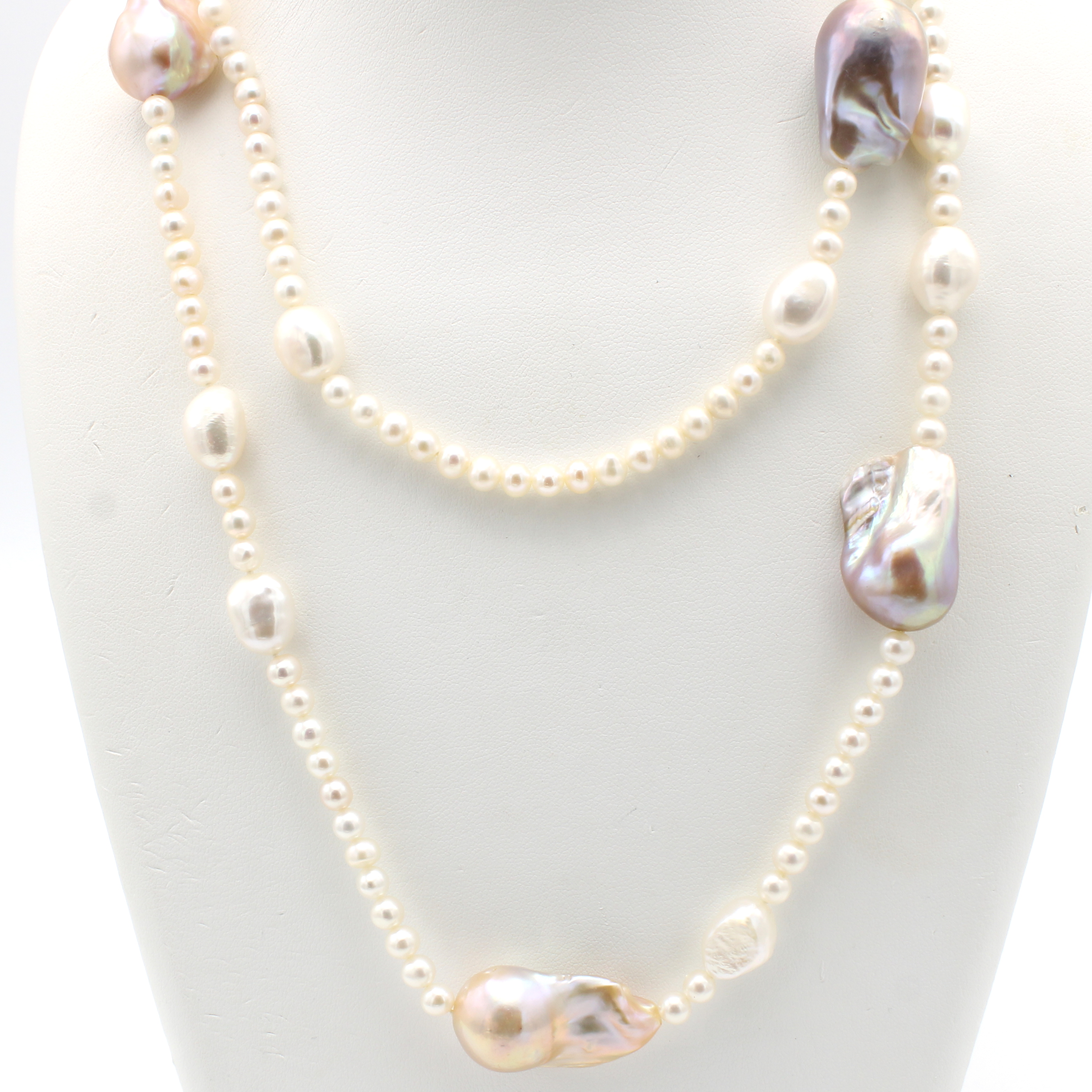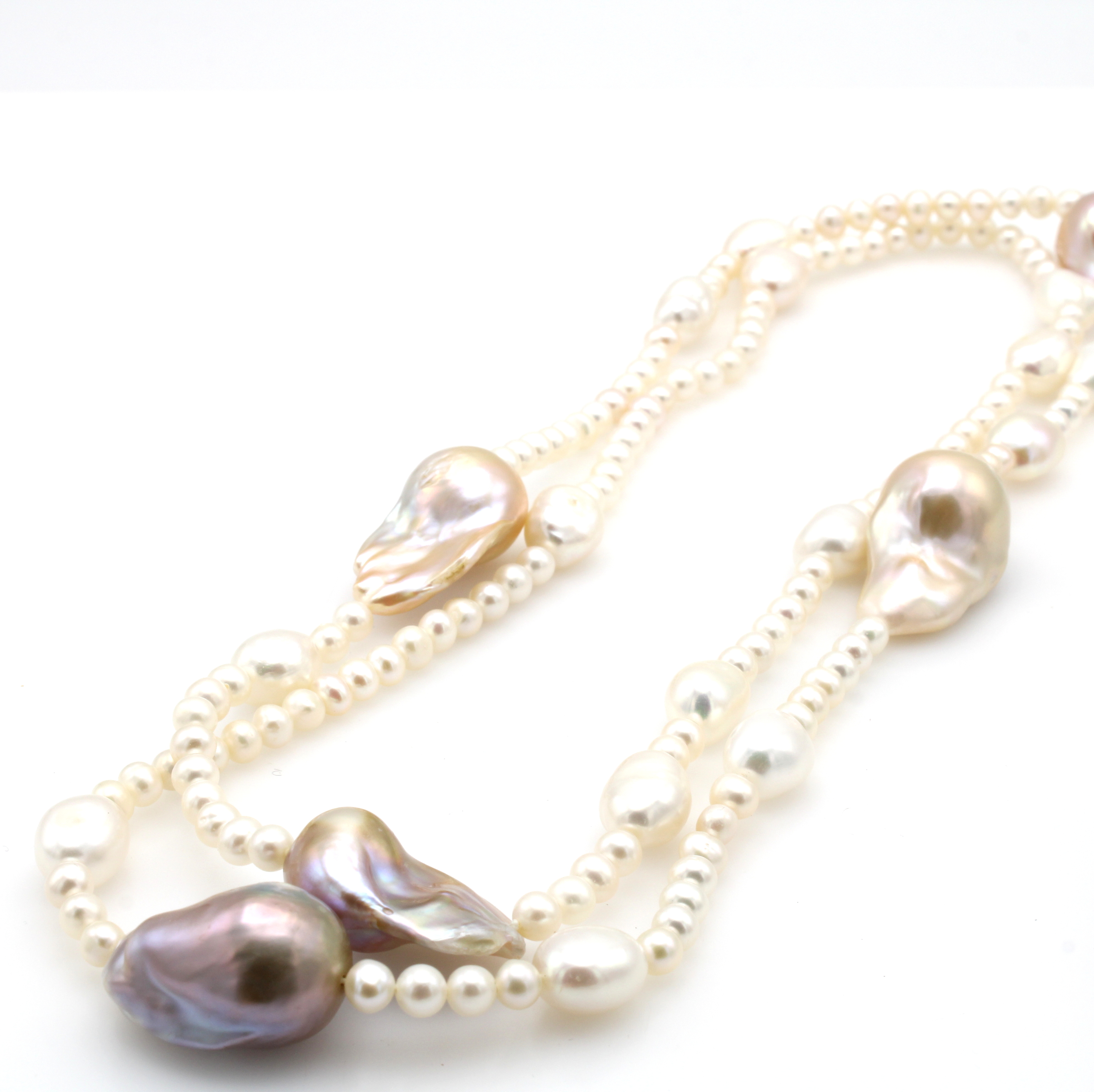 Endlose Süßwasserzuchtperlenkette, runde u. z.T. barocke Perlen v. v. weißem multicolorf. Lüster, Gesamtl. ca. 94 cm