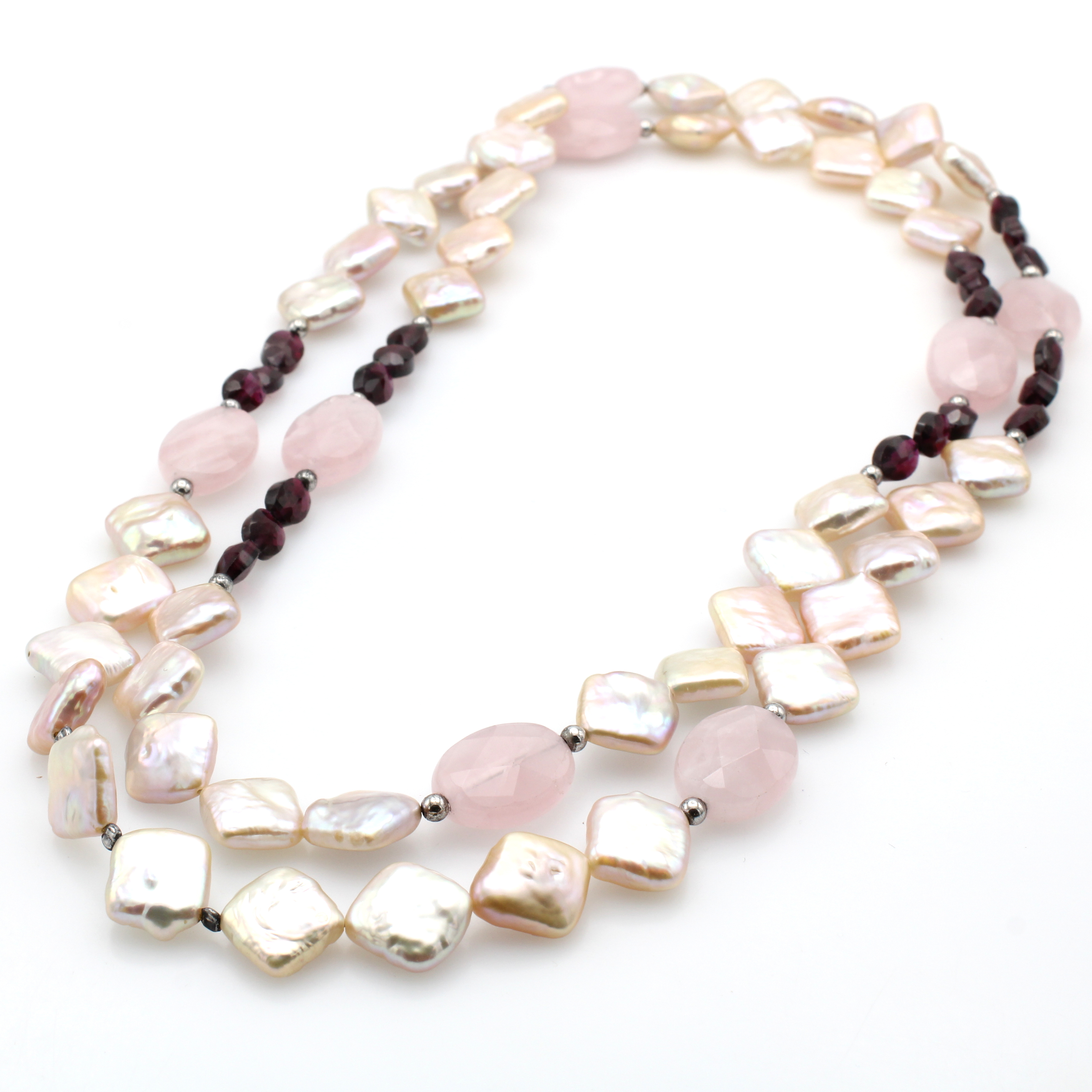 Lange Kette mit Süßwasserzuchtperlen, Granatenund Rosenquarze, Zwischenglieder 925er Silber, L. ca. 90 cm