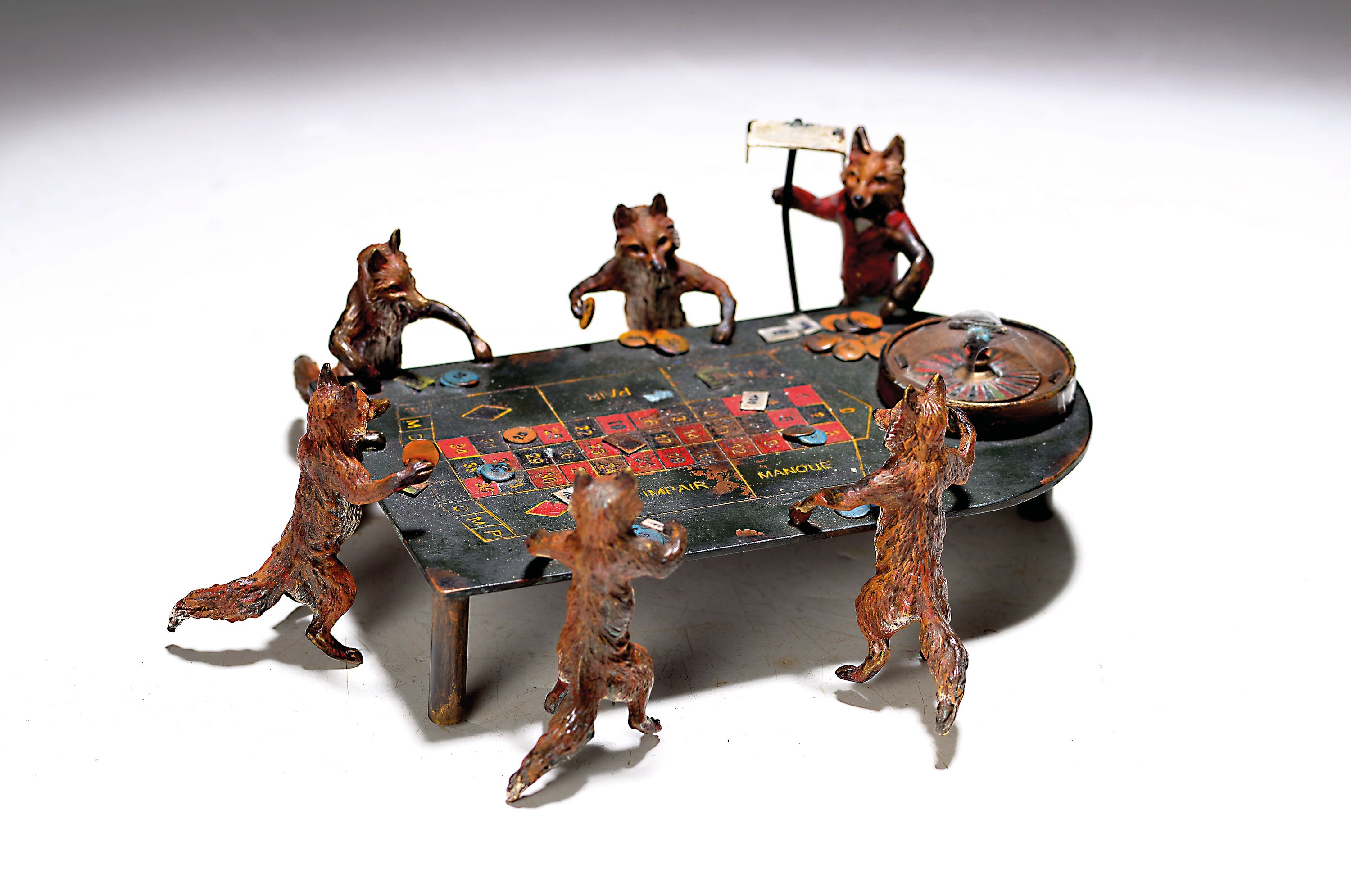 Große Wiener Bronze, signiert Bergmann, Füchse am Roulettetisch, Bronze, farbig
