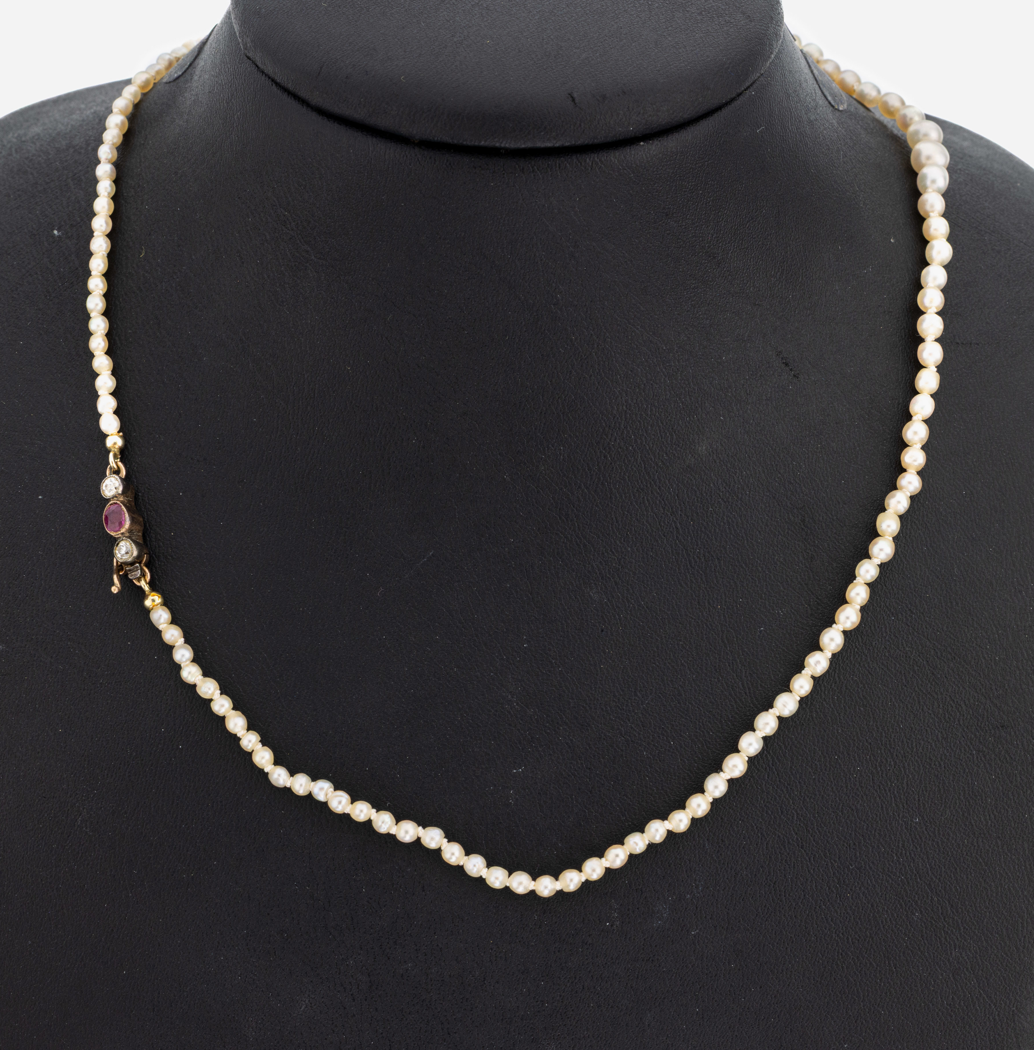 Perl-Collier mit 14 kt Gold Rubin-Diamant -Schließe, um 1900, RG 585/000 gepr.,
