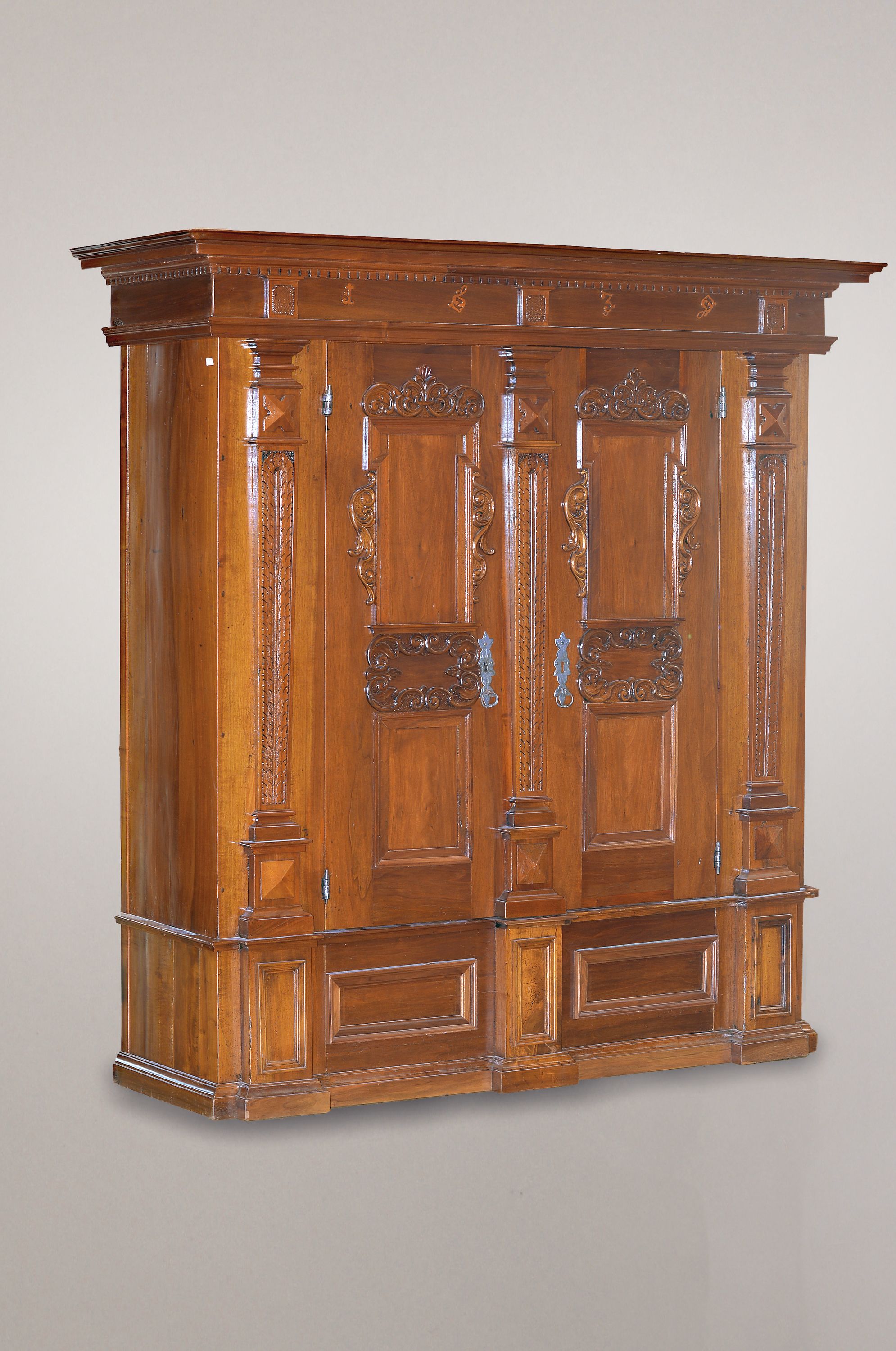 Renaissance Schrank, dat. 1639, Schweiz, Nußbaumfurnier, zweitürig, Türen vierfach
