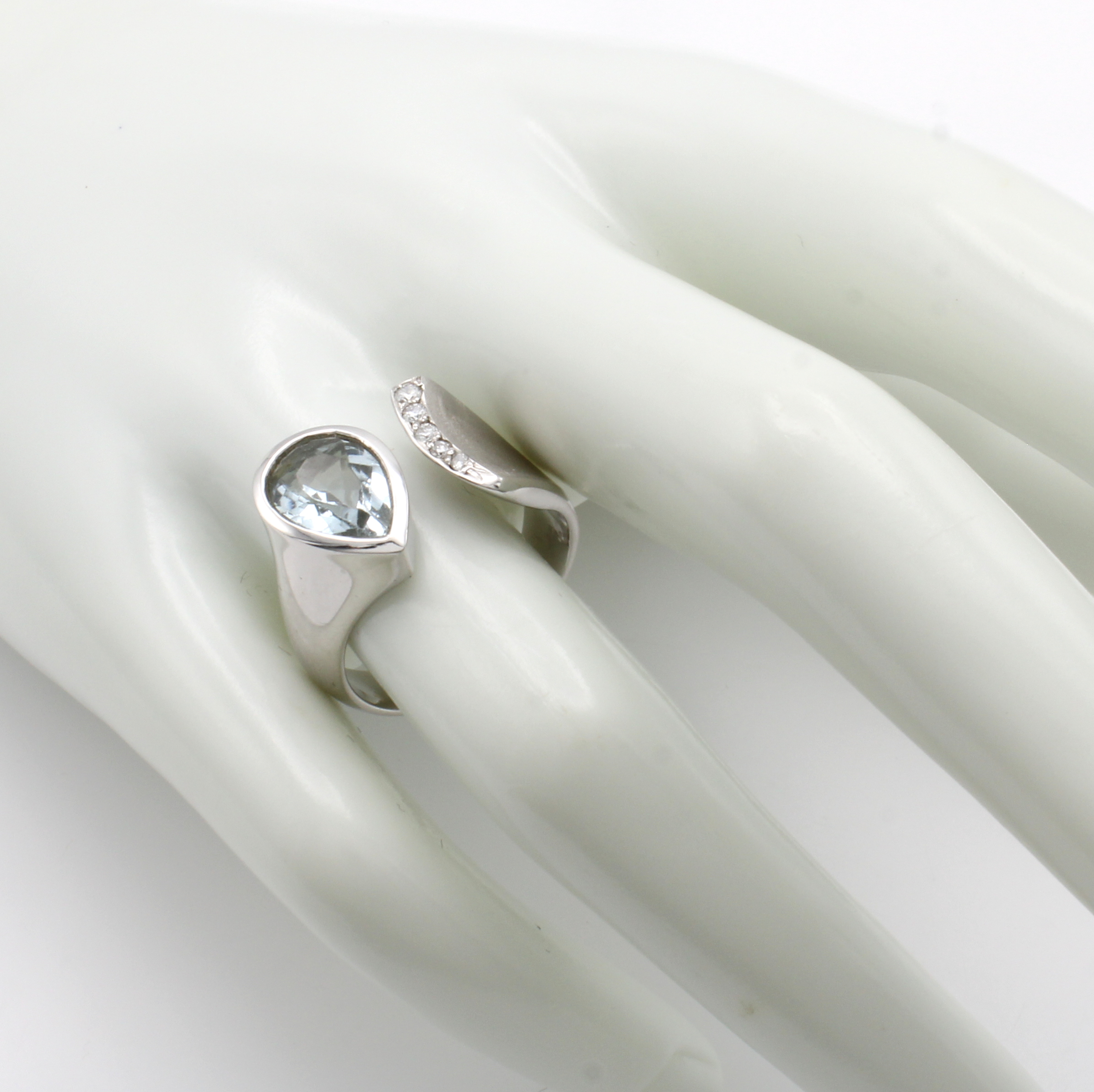 Ring mit Aquamarin und Brillanten, WG 585/ 000, Aquamarintropfen ca. 2.4 ct, Brill. zus. ca. 0.08 ct Weiß/si, Schiene z.T. matt. u. offen gearb., RW ca. 56 Schätzpreis: 4220, - EUR