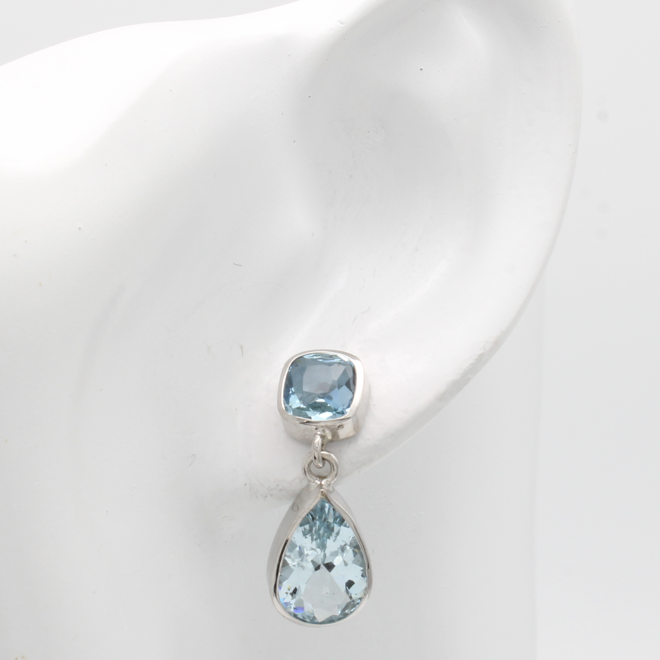 Paar Ohrstecker mit Aquamarinen, WG 585/000, 4 Aquamarine in Carrée- u.- Tropfenform zus. 8.2 ct, Abhängungen bewegl. Schätzpreis: 3250, - EUR