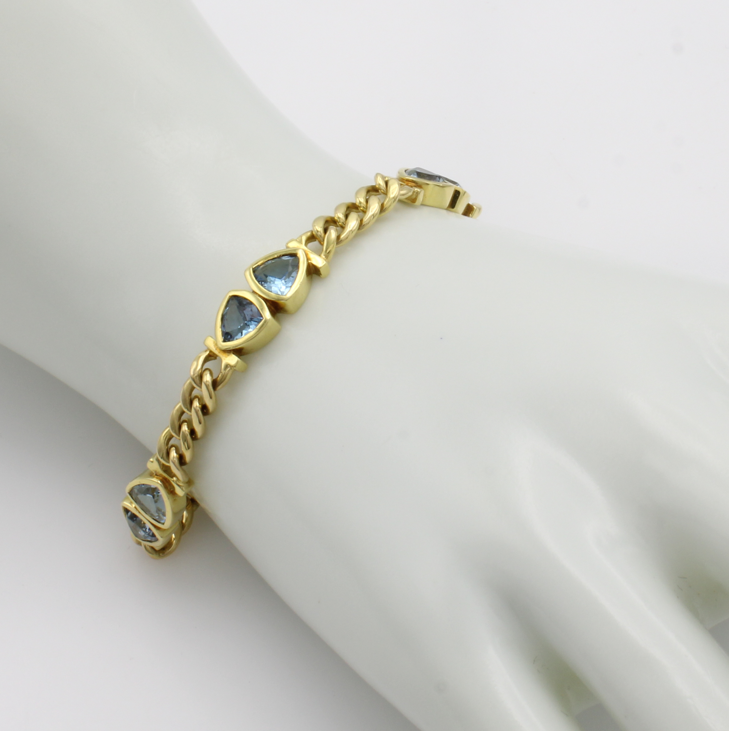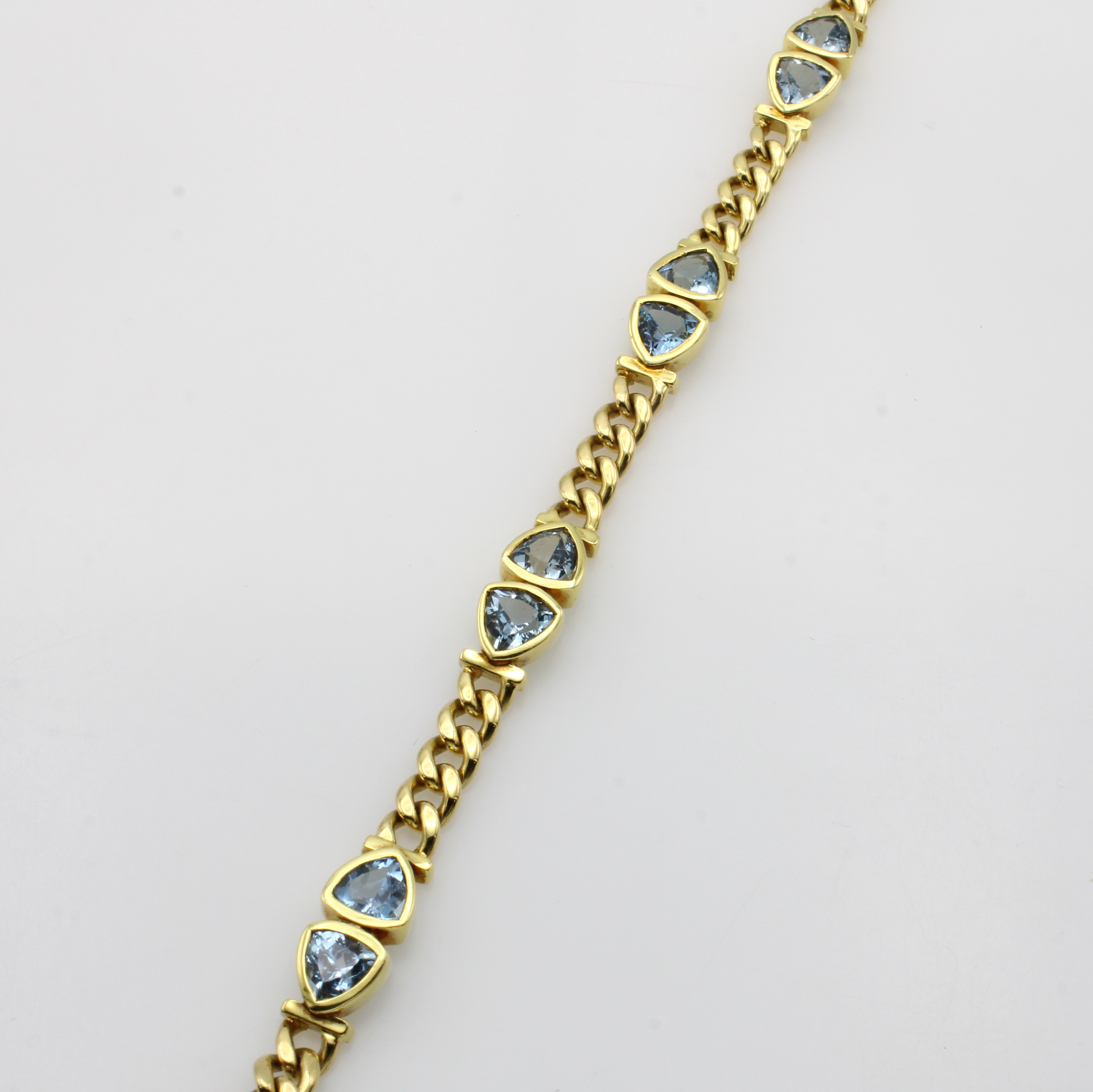 Panzerarmband mit Aquamarinen, GG 585/000, 10 dreieckige Aquam. zus. ca. 6 ct, Kasten- schl. m. doppelter Sicherheitsacht, L. ca. 19 cm Schätzpreis: 7500, - EUR