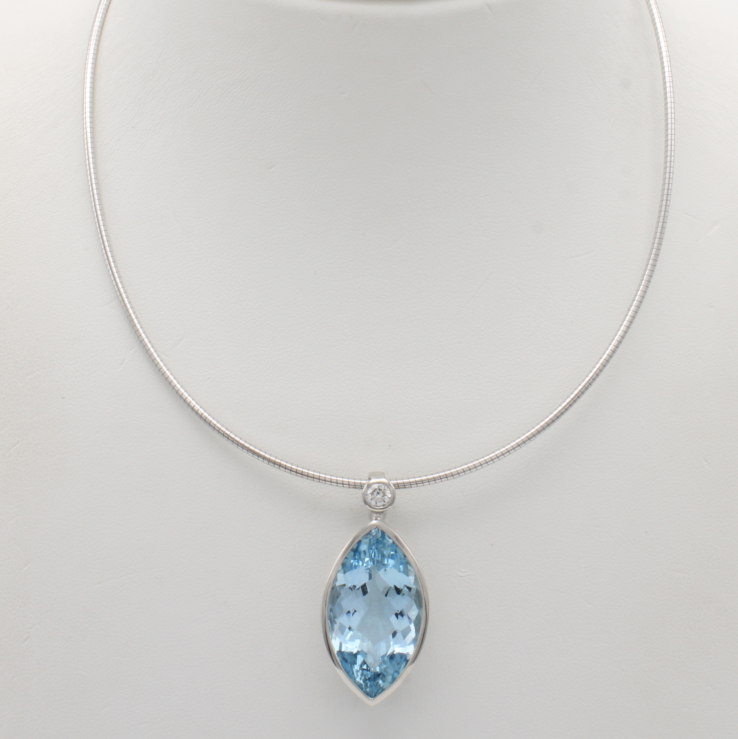 Anhänger mit Aquamarin und Brillant an Omega- reif, WG 750/000, Reif WG 585/000, navettef. Aquam. ca. 19.82 ct, Brill. ca. 0.24 ct feines Weiß/vs, Endöse v. Reif zum Aufsch- rauben, L. ca. 45 cm Schätzpreis: 22000, - EUR