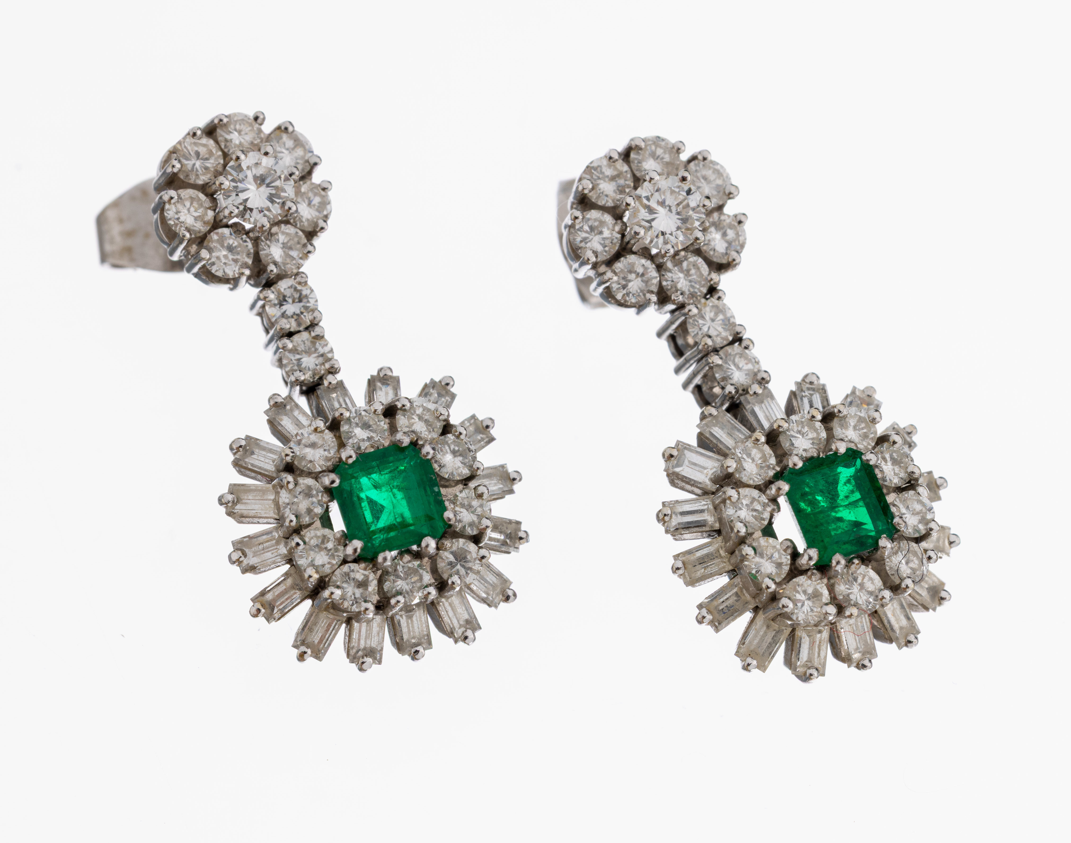 Paar 18 kt Gold Smaragd-Diamant-Ohrstecker, WG 750/000, 1970er Jahre, länglich bewegl.,