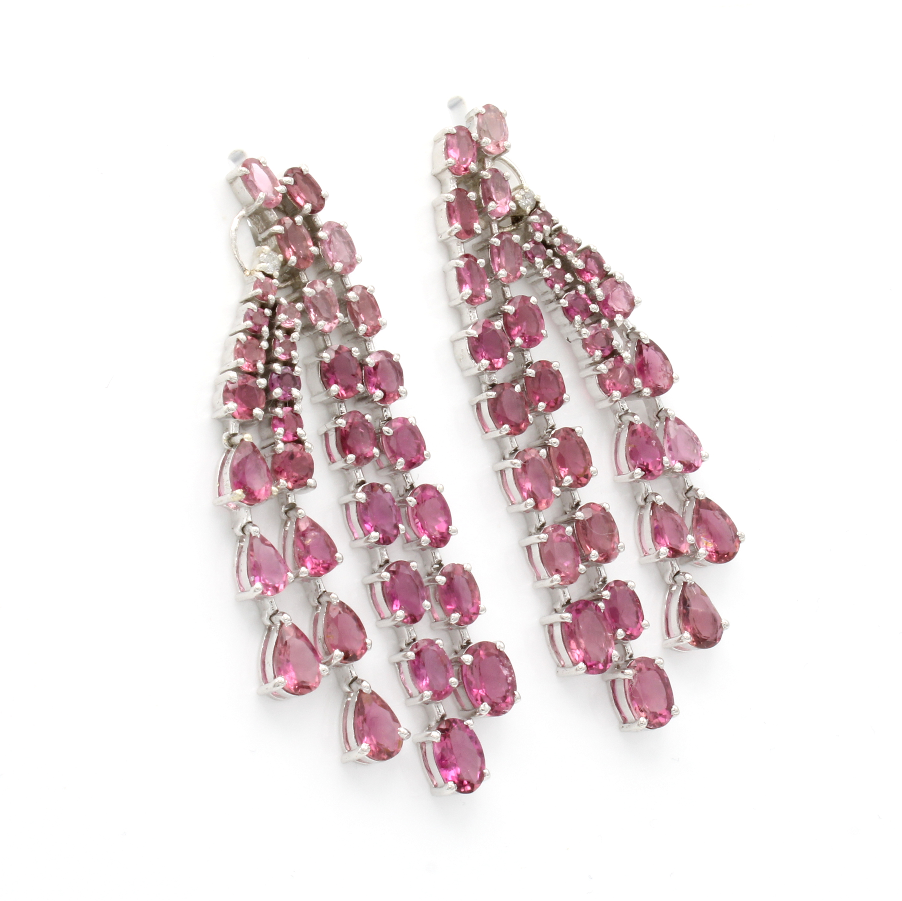 Paar Ohrstecker mit Turmalinen und Diamanten, 925er Silber, z.T. bewegl. Abhängungen, pinkfarb. Turmaline in versch. Schliffarten zus. ca. 20.50 ct, Diam. zus. ca. 0.12 ct Weiß-get./p Schätzpreis: 4800, - EUR