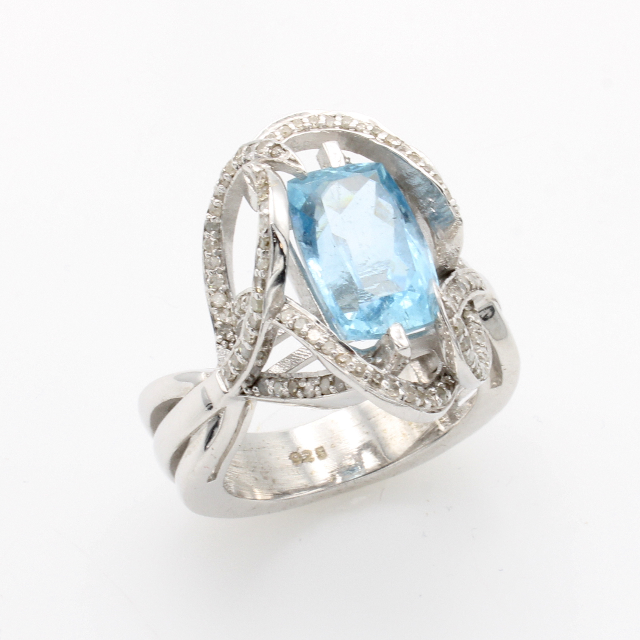 Ring mit Aquamarin und Diamanten, 925er Silber, Ringschiene in 3-rhg. Optik, fac. Aquamarin ca. 4.65 ct umhüllt von verschlungenen Elementen bes. m. Diam. zus. ca. 0.90 ct Weiß-get./p, RW ca. 56 Schätzpreis: 2700, - EUR