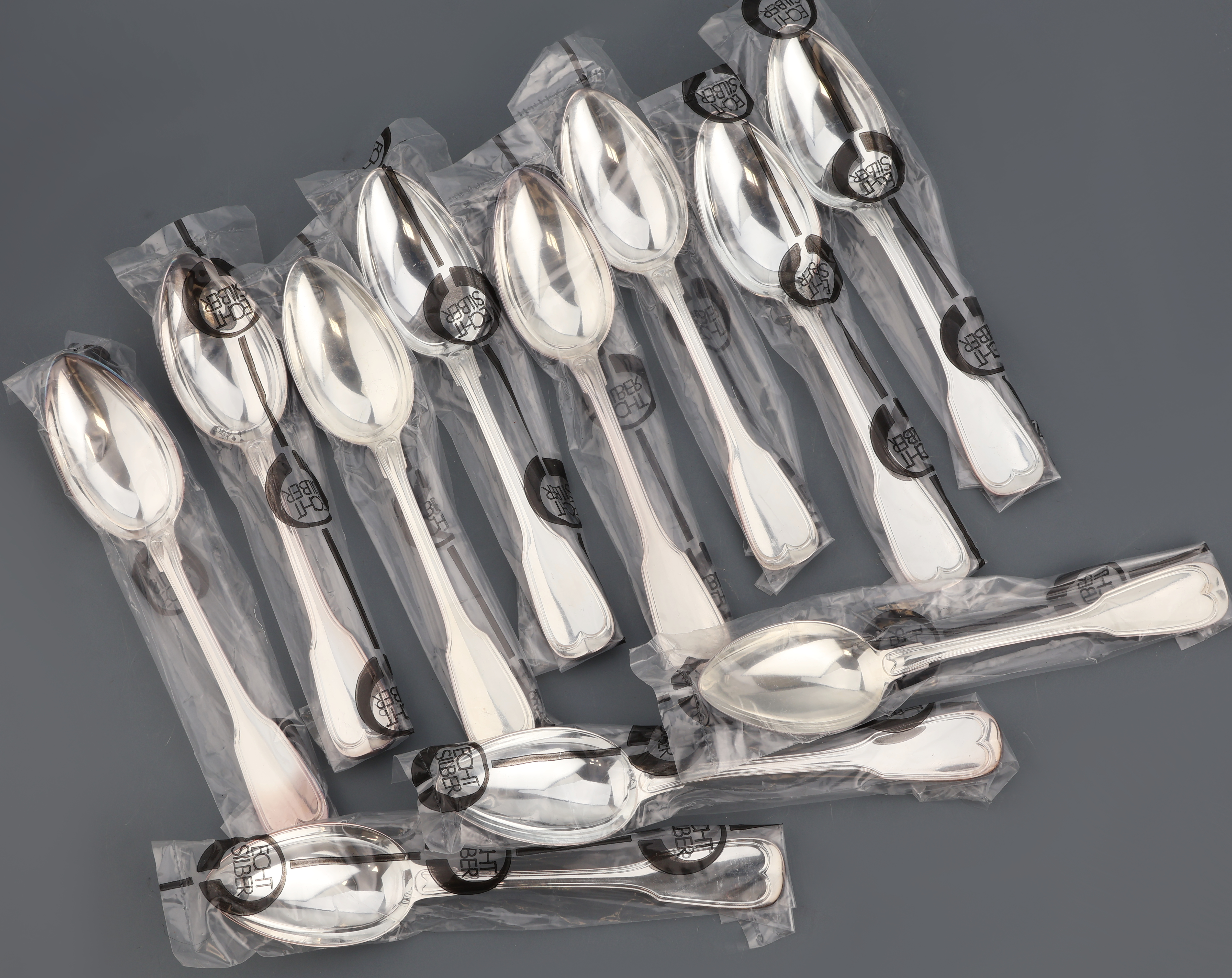 12 Menuelöffel, 12 Frühstücksmesser (Griffe gefüllt, Klingen Stahl), 12 Früh-
