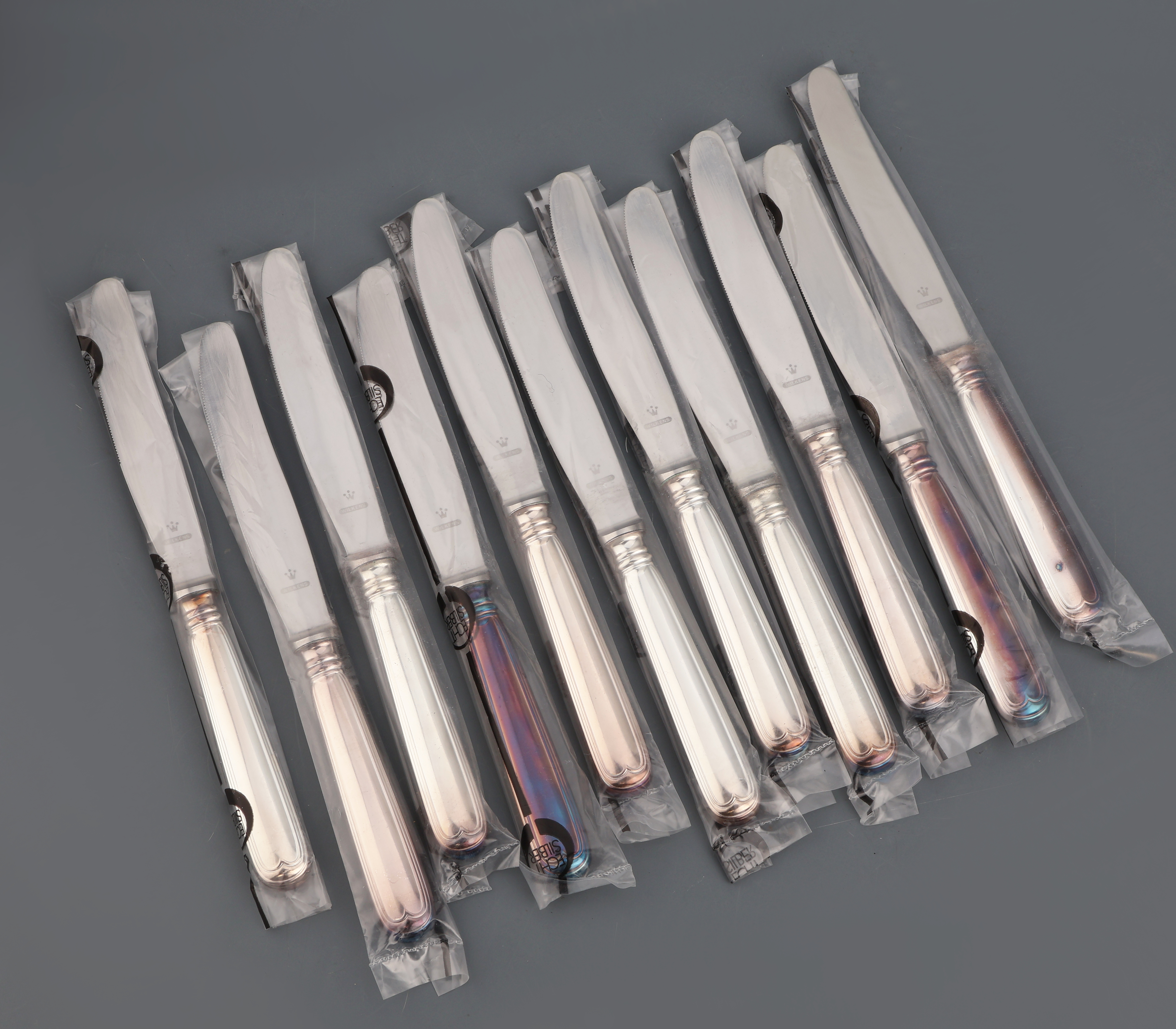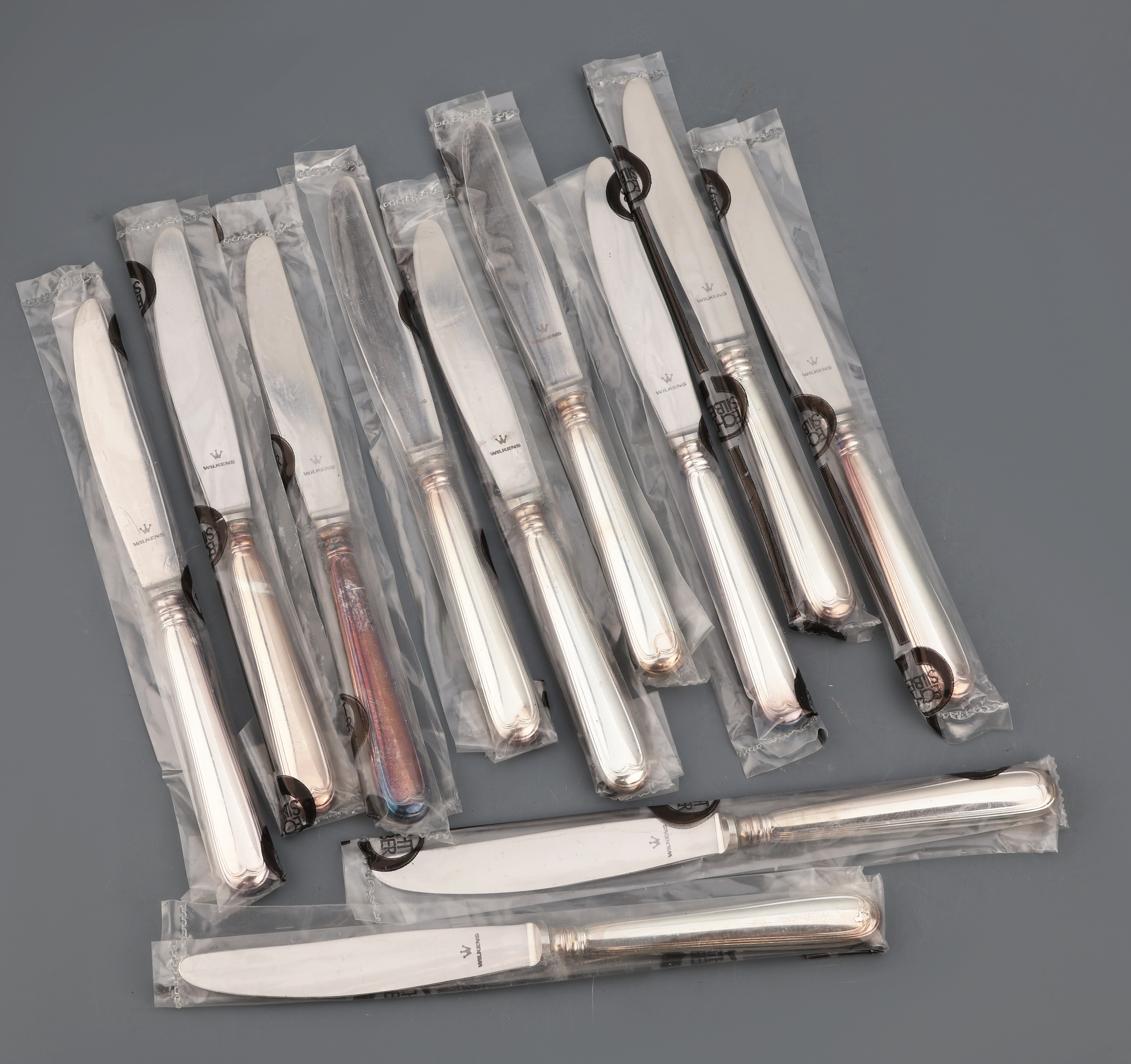 Faden, best. aus: 12 Menuemesser (Griffe gefüllt, Klingen Stahl), 12 Menue- gabeln,