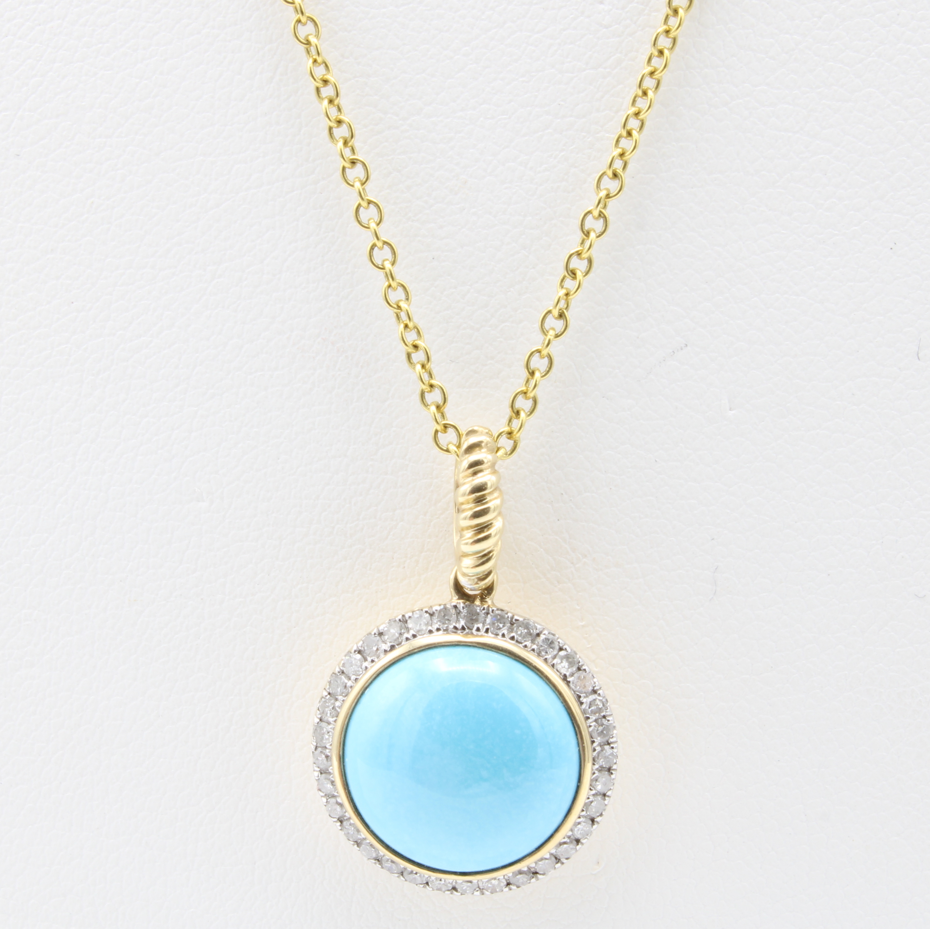 Anhänger mit Türkis und Brillanten an Kette, Türkiscabochon, D. ca. 12 mm, Brill. zus. ca. 0.285 ct Weiß/p, L. ca. 45 cm Schätzpreis: 1800, - EUR