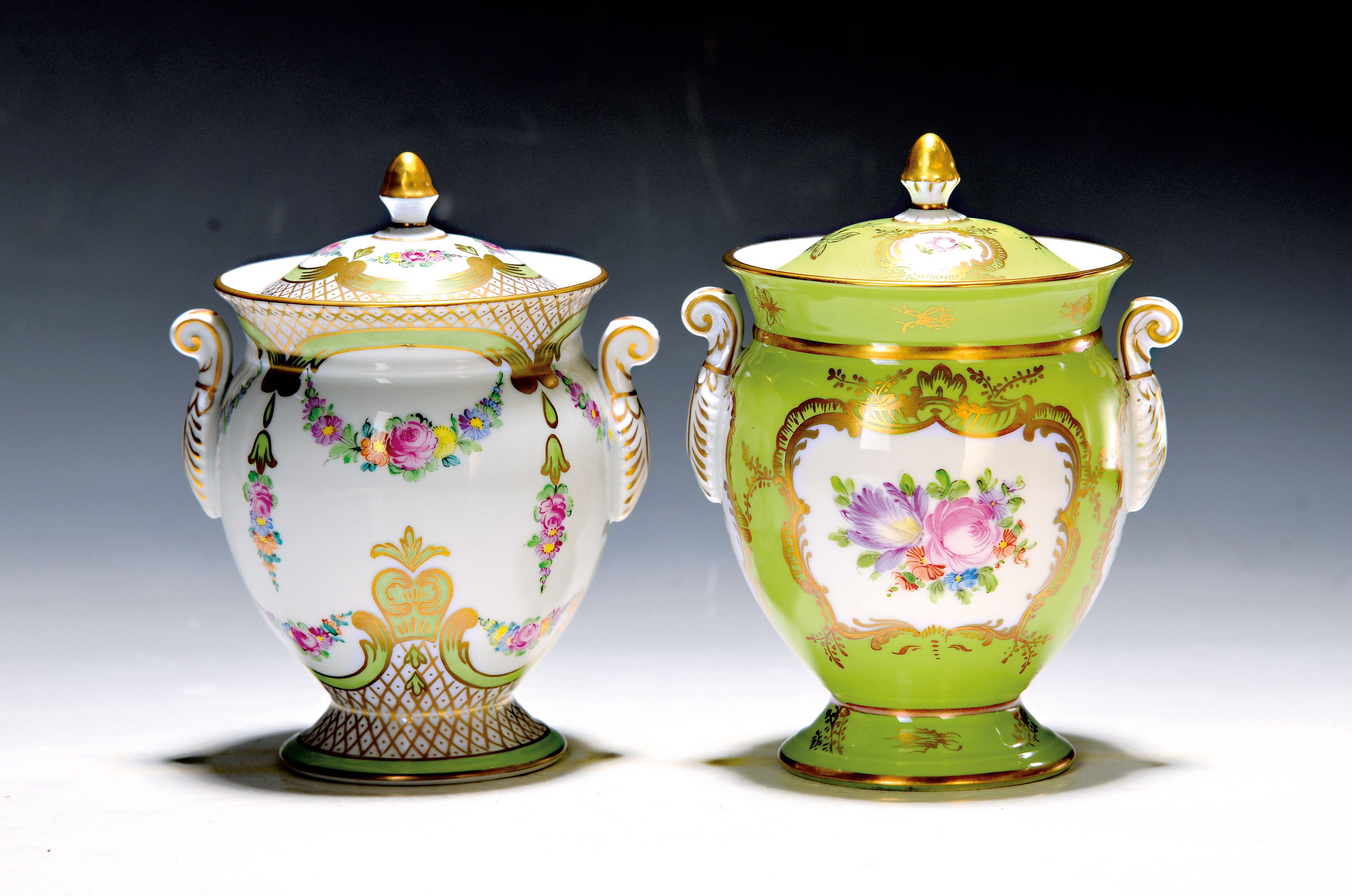 2 Deckelvasen, Dresden, um 1900, Porzellan, partiell grüngrundig, reiche Goldstaffage,