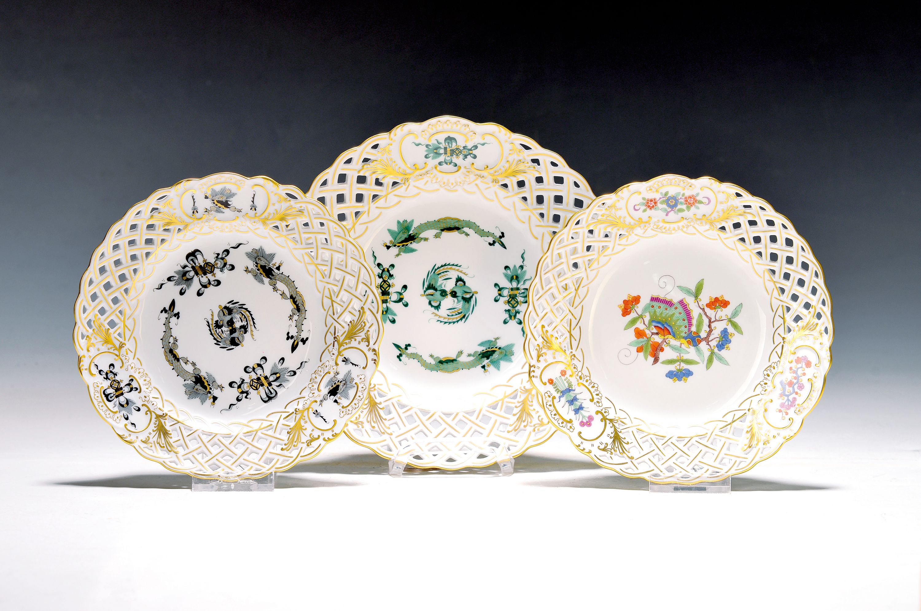 3 Zierteller, Meissen, 20. Jh., 1. Wahl, Ränder in Durchbrucharbeit mit reicher