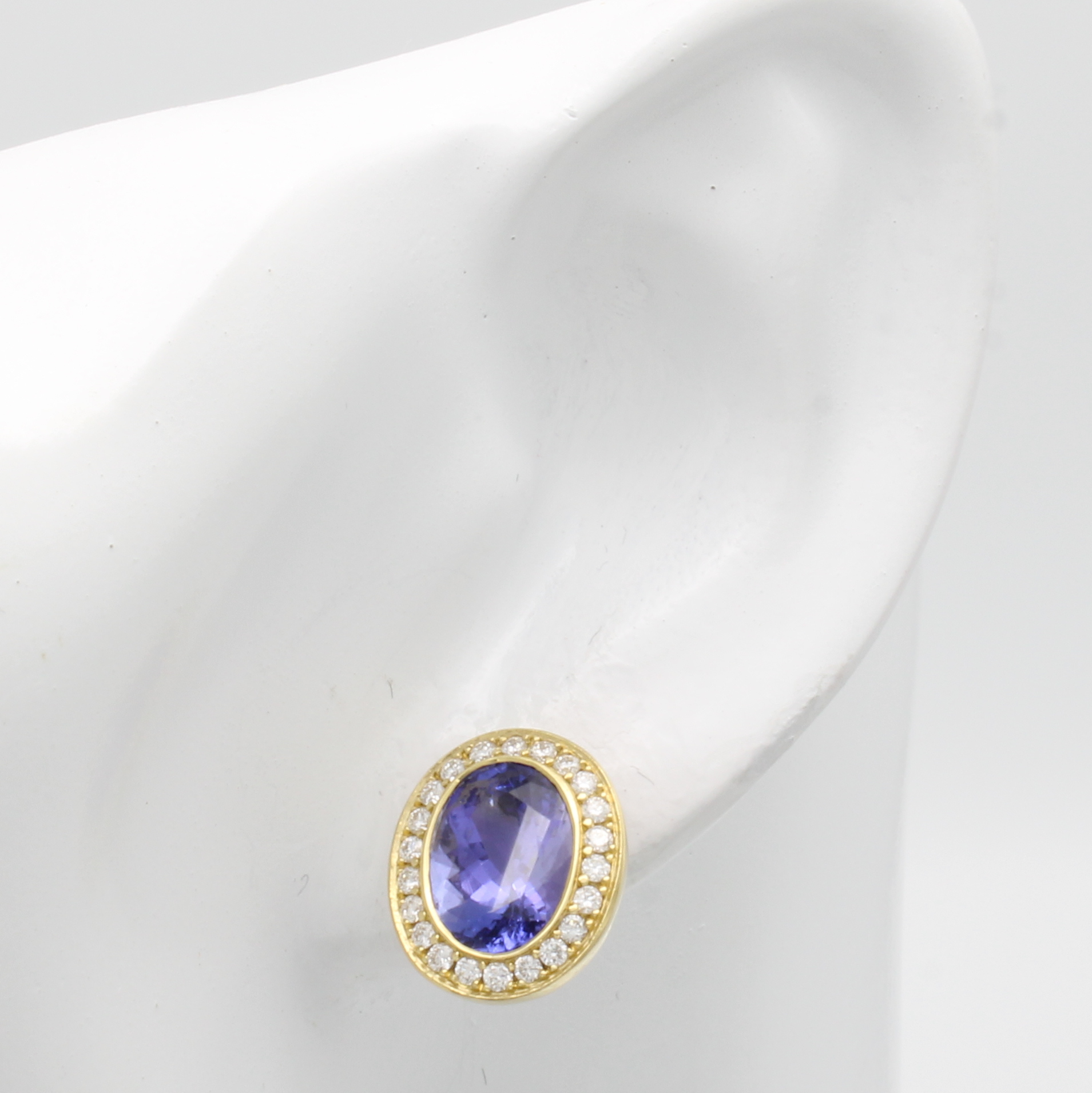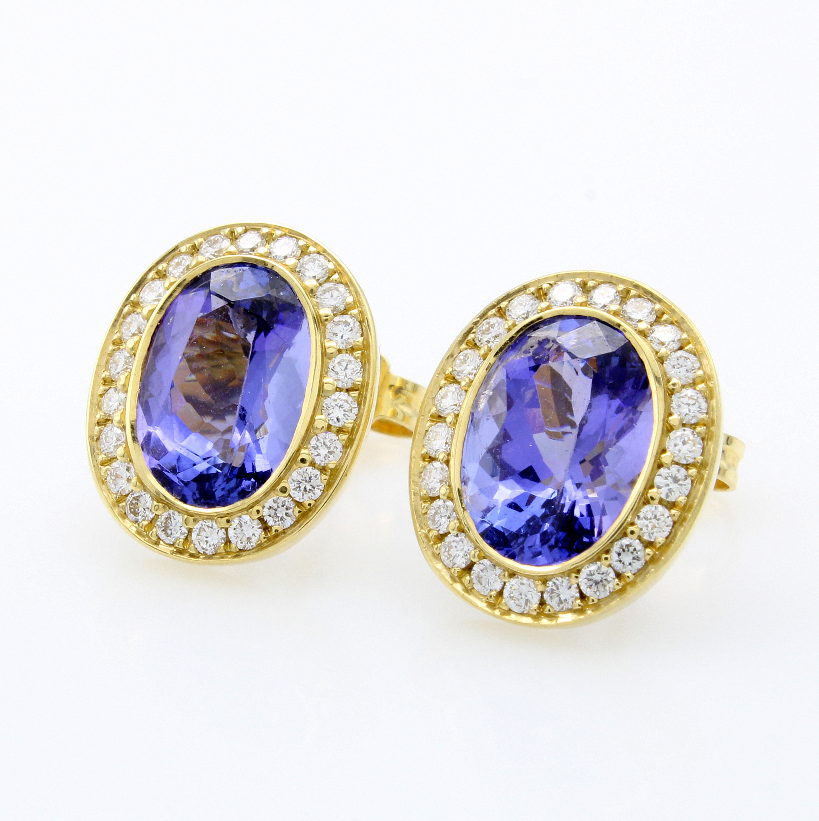 Paar Ohrstecker mit Tansaniten und Brillanten, GG 750/000, 2 ovale Tansanite zus. ca. 6 ct umfasst v. Brill. zus. ca. 0.53 ct feines Weiß/vs-si Schätzpreis: 8500, - EUR