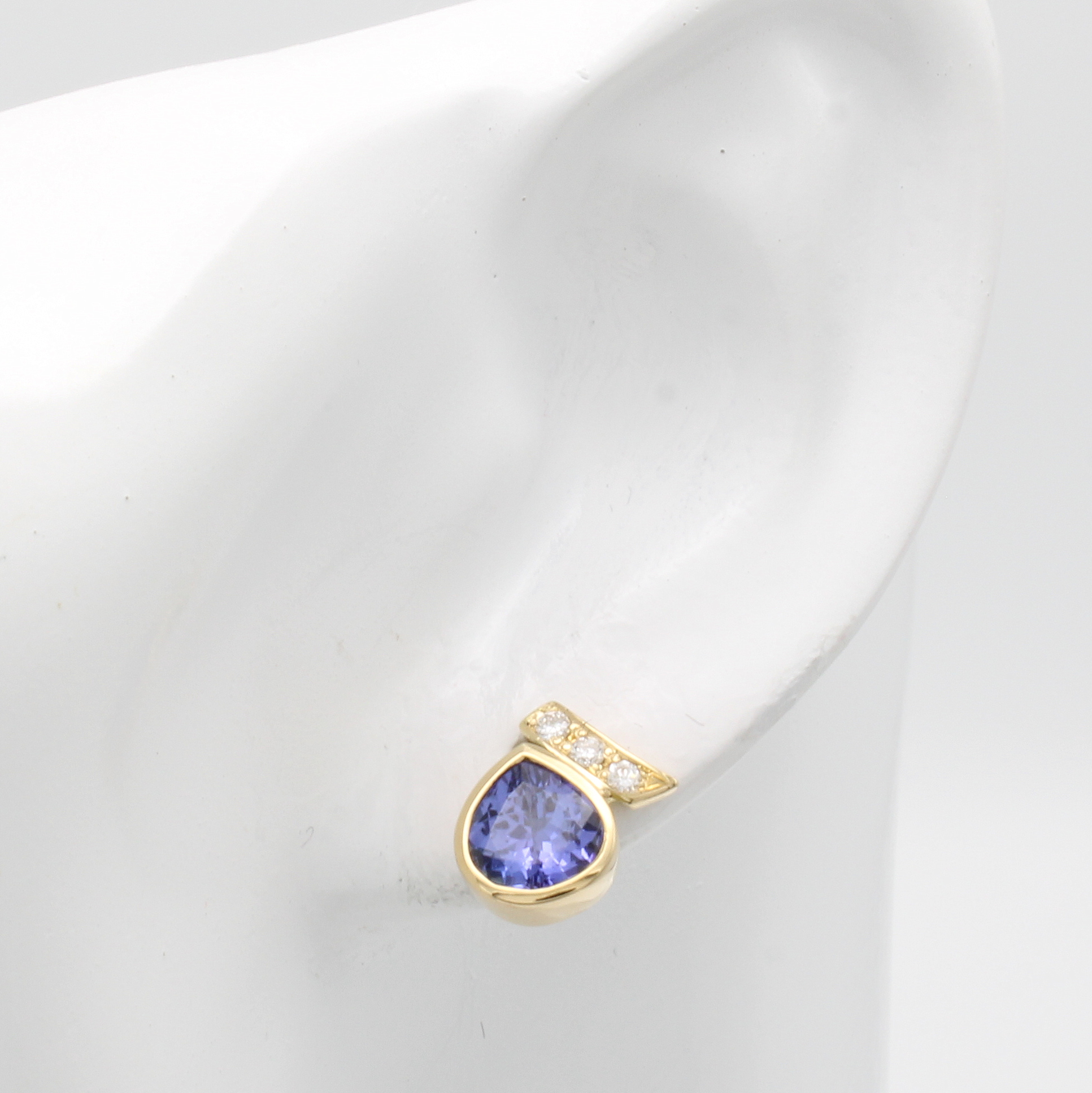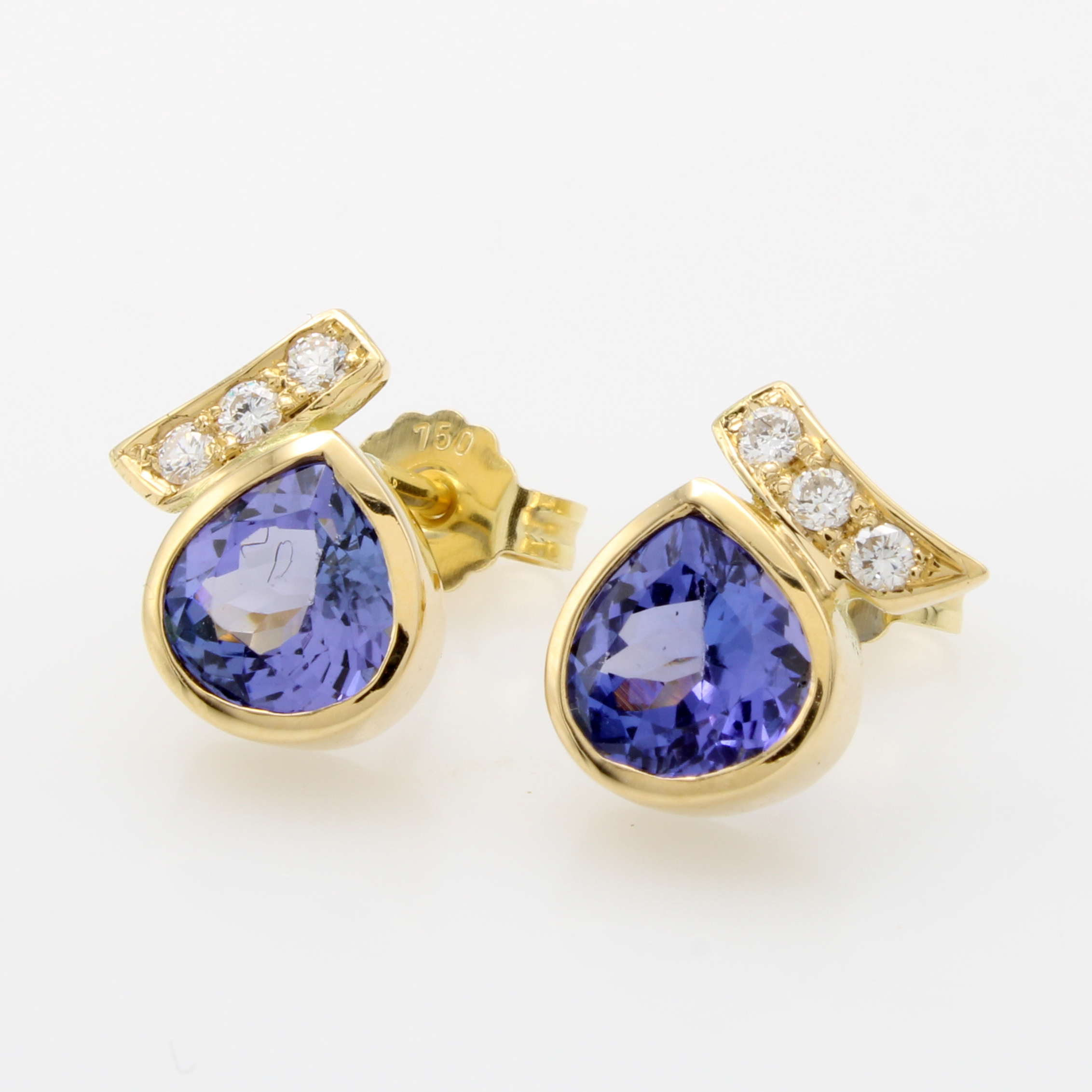 Paar Ohrstecker mit Tansaniten und Brillanten, GG 750/000, 2 Tansanittropfen zus. ca. 2.6 ct, Brill. in gebogene Stäbe gef. zus. ca. 0.14 ct feines Weiß/vs-si Schätzpreis: 3500, - EUR