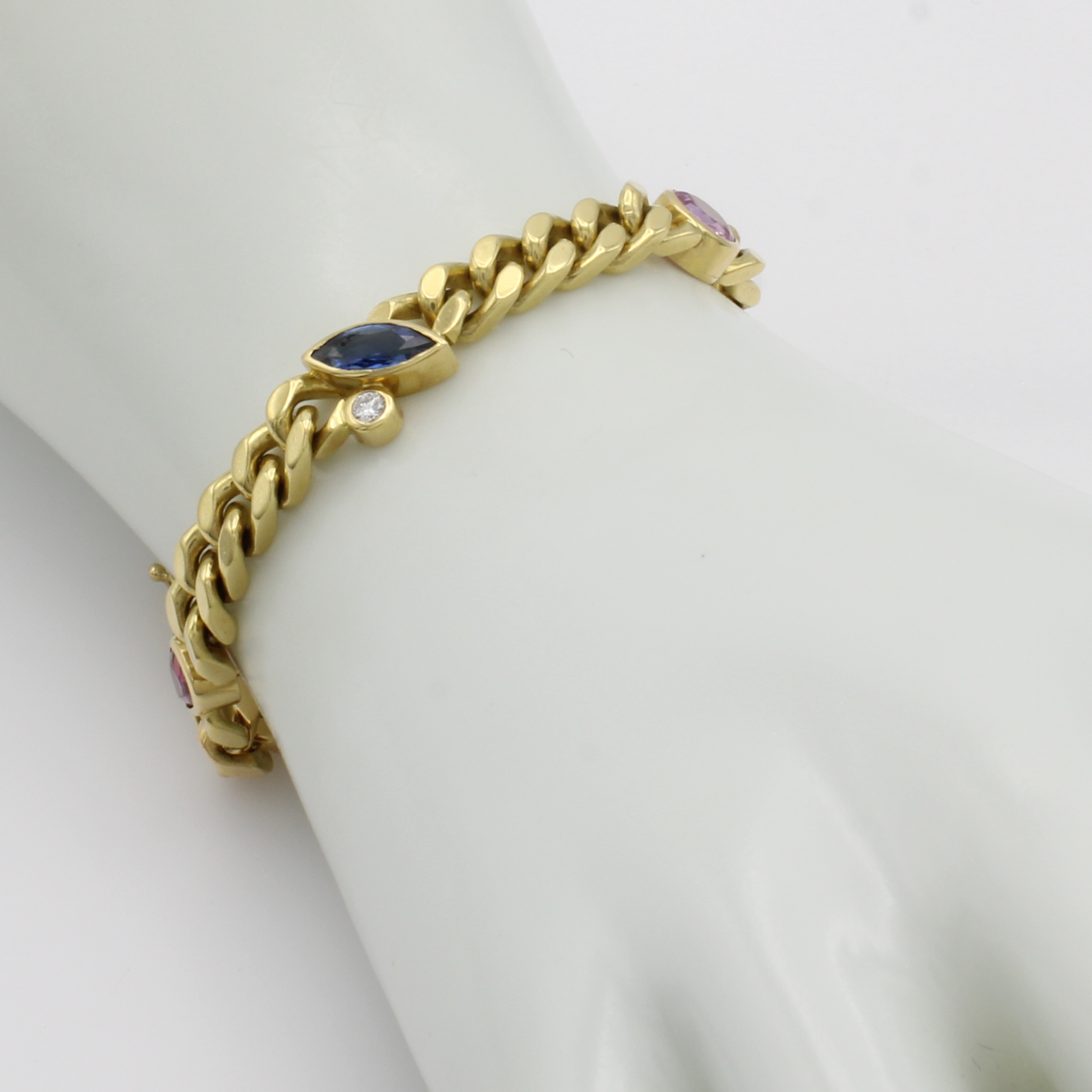 Panzerarmband mit Saphiren und Brillanten, GG 750/000, 5 bunte Saphire in versch. Schliffarten zus. ca. 5 ct, 2 Brill. zus. ca. 0.12 ct Weiß/vs, Kastenschl. m. doppelter Sicherheitsacht, L. ca. 18 cm. Schätzpreis: 12900, - EUR