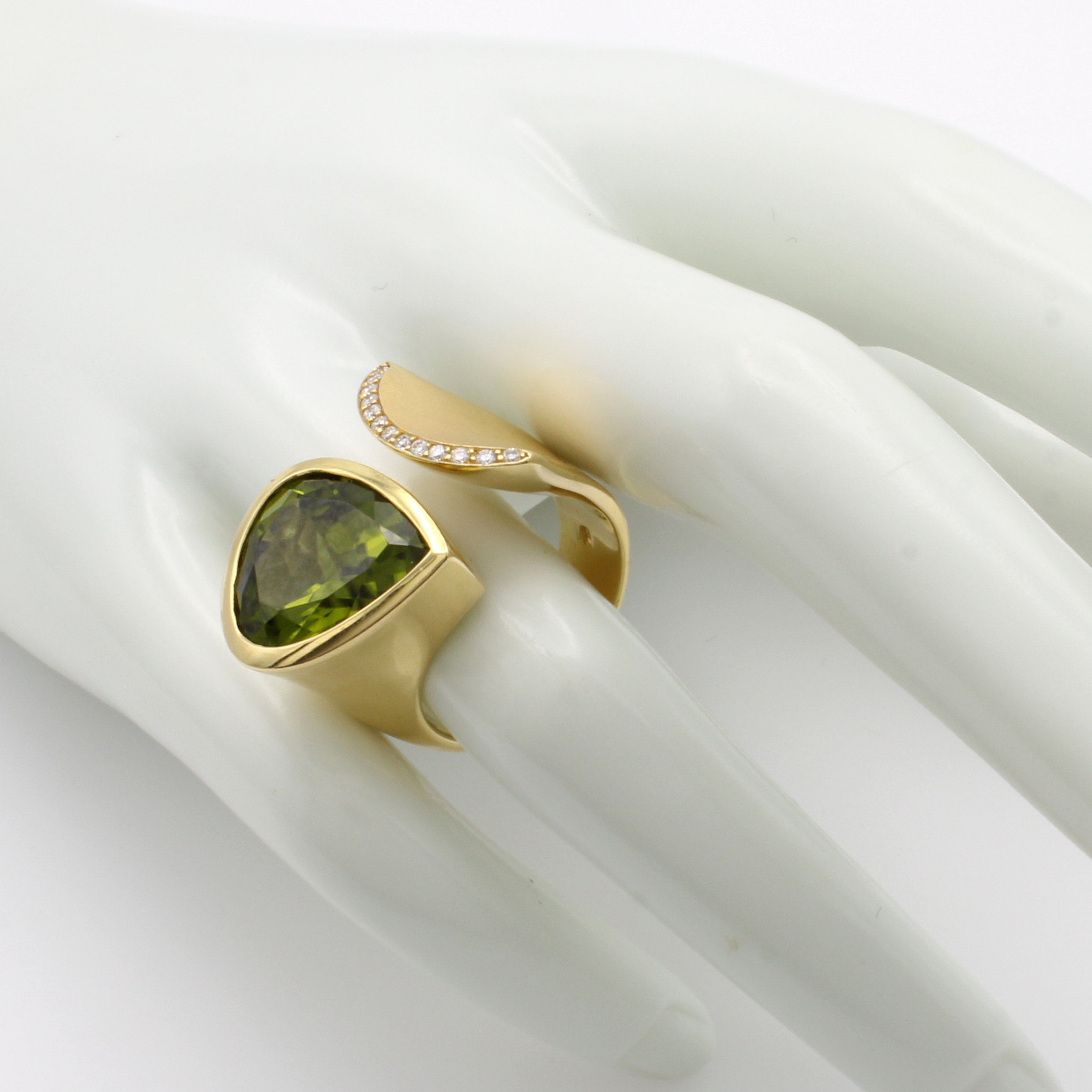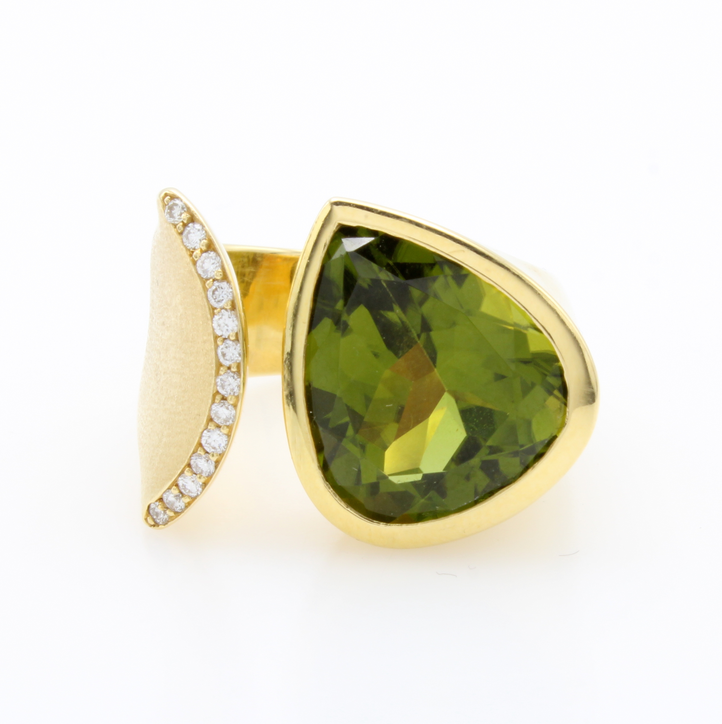 Ring mit Peridot und Brillanten, GG 750/000, Schiene offen u. z.T. matt., Peridottropfen ca. 10 ct, Brill. zus. ca. 0.14 ct feines Weiß/si, Gesamtgew. ca. 25.1 g, RW ca. 58 Schätzpreis: 11000, - EUR