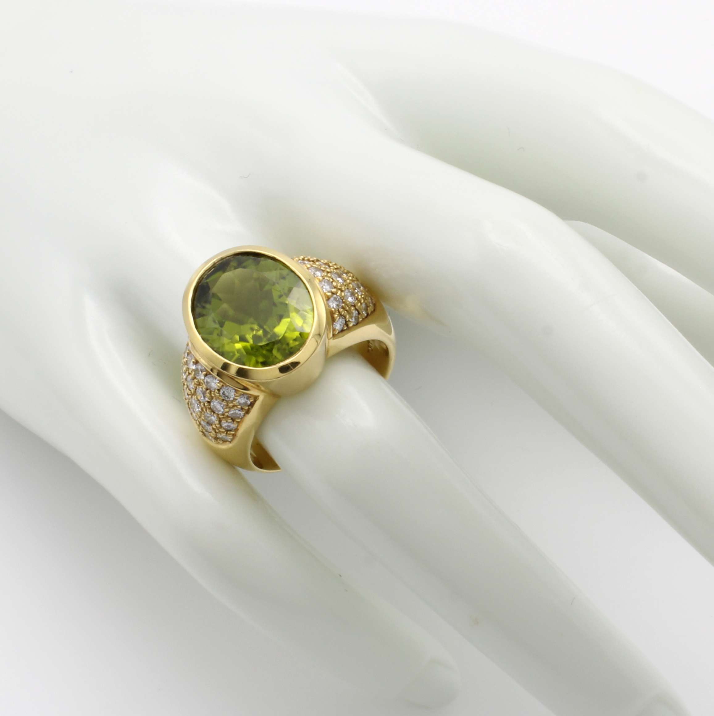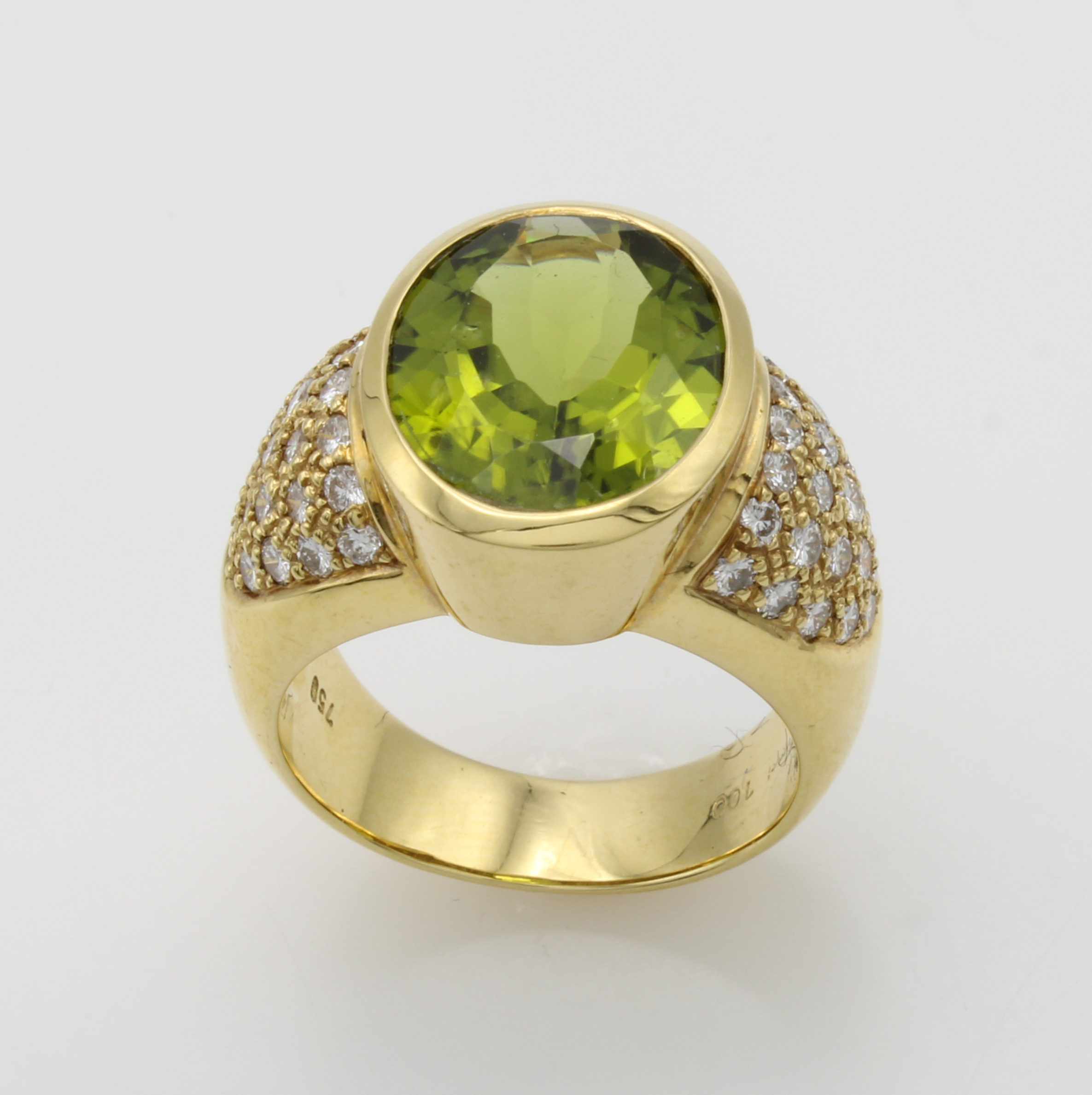 Ring mit Peridot und Brillanten, GG 750/000, ovaler Peridot ca. 8.2 ct, Brill. in Ring- schultern gef. zus. ca. 1 ct feines Weiß/vs-si, RW ca. 56 Schätzpreis: 10500, - EUR