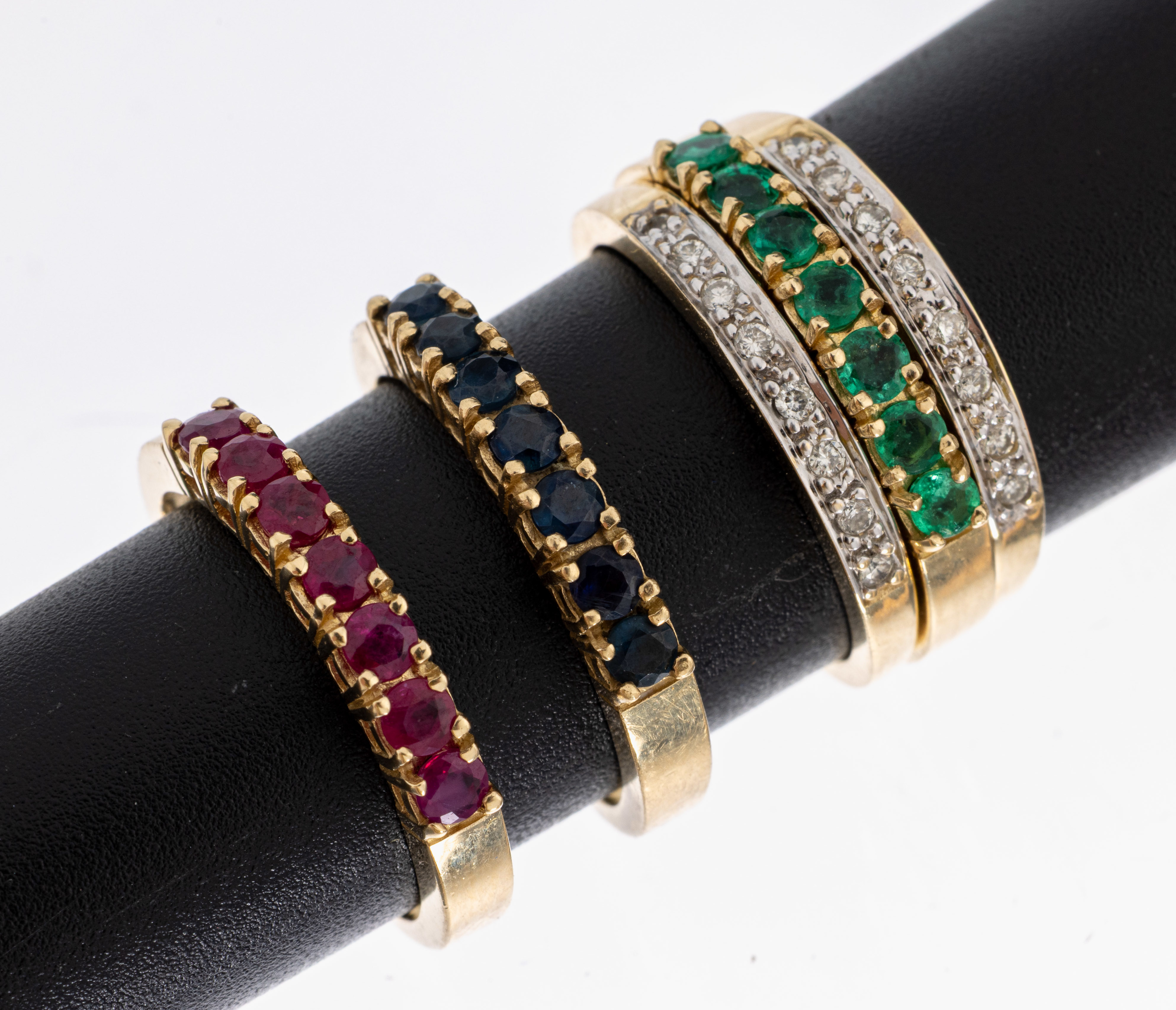 14 kt Gold Brillant-Farbstein-Ringquartett, GG 585/000, 1 Ring, 2 rhg. Ringschiene,