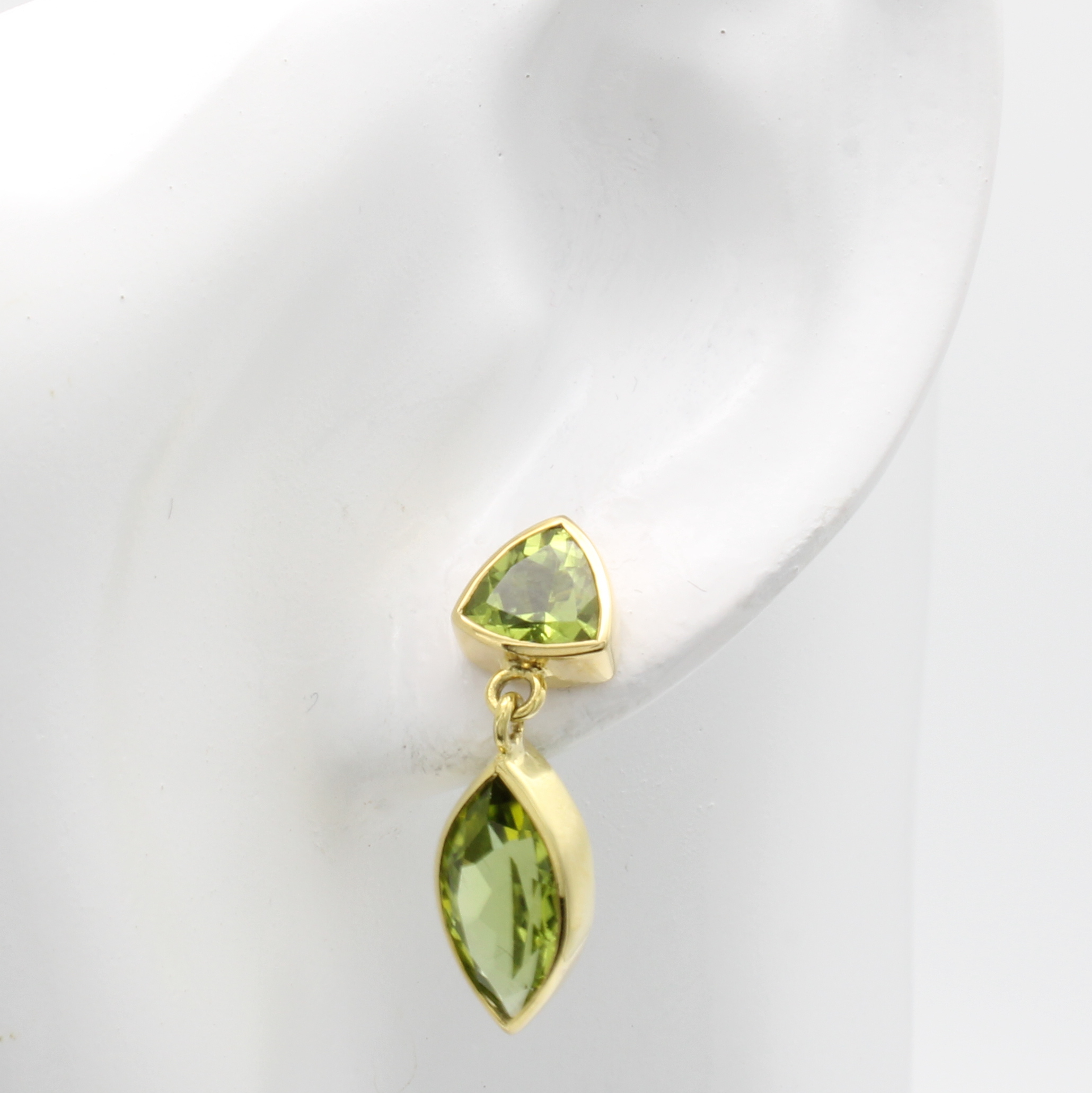 Paar Ohrstecker mit Peridots, GG 585/000, dreieckige u. navettef. Peridots zus. ca. 7.8 ct, Abhängungen bewegl. Schätzpreis: 2280, - EUR