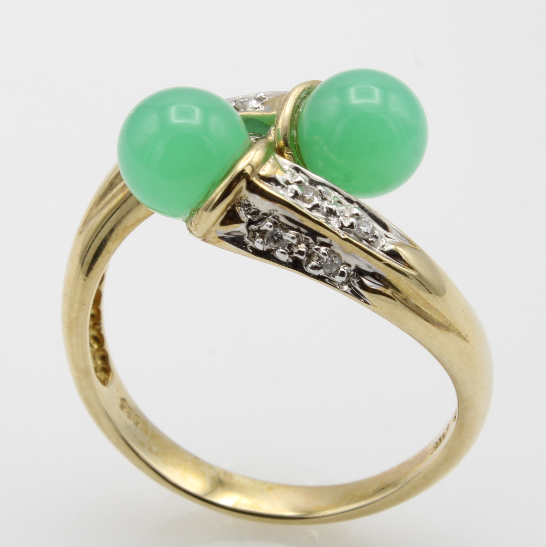 Ring mit Brillanten und Chrysoprasen, GG 585/000, Brill. zus. ca. 0.048 ct Weiß/si-p, 2 Chrysopraskugeln, RW ca. 57 Schätzpreis: 1000, - EUR