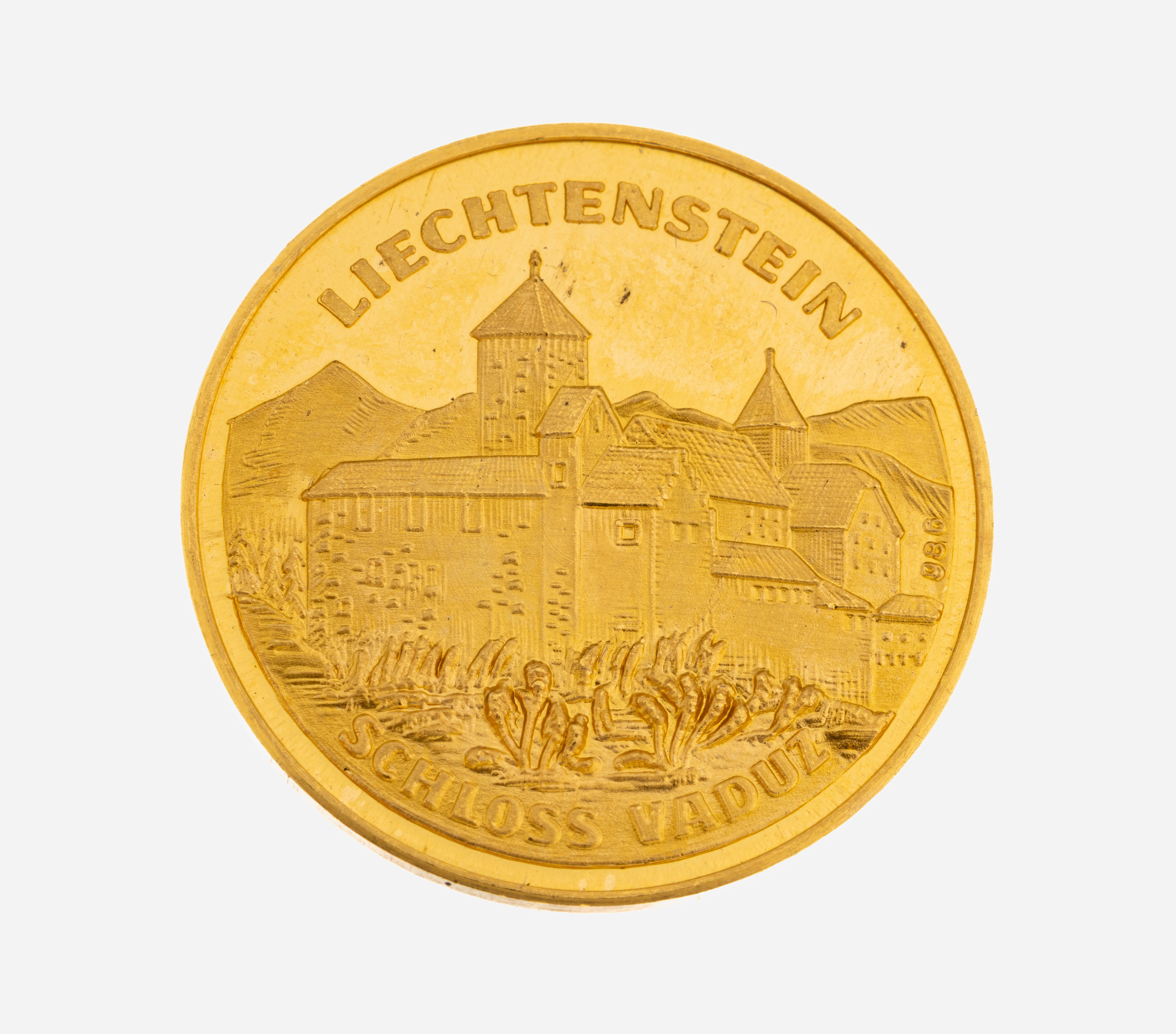Goldmedaille "Liechtenstein", GG 986/000, AV: Ansicht Schloss Vaduz, RV: Wappen der